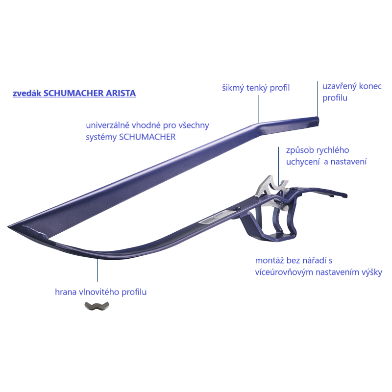 A05H1.04 Zvedák klasů ARISTA-100 SCHUMACHER - zvedač klasů ARISTA maximalizuje váš výnos tím, že s jistotou zvládá obtížné situace při sklizni, jako je polehlé obilí, a minimalizuje ztráty na úrodě. I vy tak můžete získat perfektní úrodu. Díky svému rychloupínacímu systému QuickFit s integrovaným nastavením výšky je montáž extrémně časově nenáročná, uživatelsky přívětivá a představuje tak přínosnou inovaci. Montáž bez nářadí s dvoustupňovým nastavením výšky. Zvýšená odolnost proti opotřebení díky osvědčené skluznici WaveTrack.