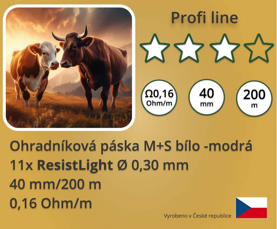 Balení 4+1 ZDARMA - Ohradníková páska Profi line M+S 40 mm/200 m ResistLight bílo-modrá odpor 0,16 Ohm/m - nejkvalitnější vodivá PE páska na elektrický ohradník s 11x 0,30 mm ResistLight vodičem. Měrný odpor elektrické ohradníkové pásky je pouze 0,16 Ohm/m . Vodivá páska pro el. ohradník je určena pro dlouhé a trvalé ohrady.