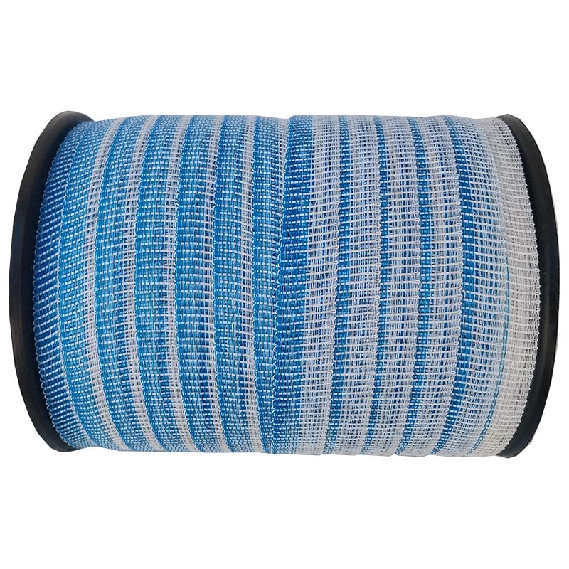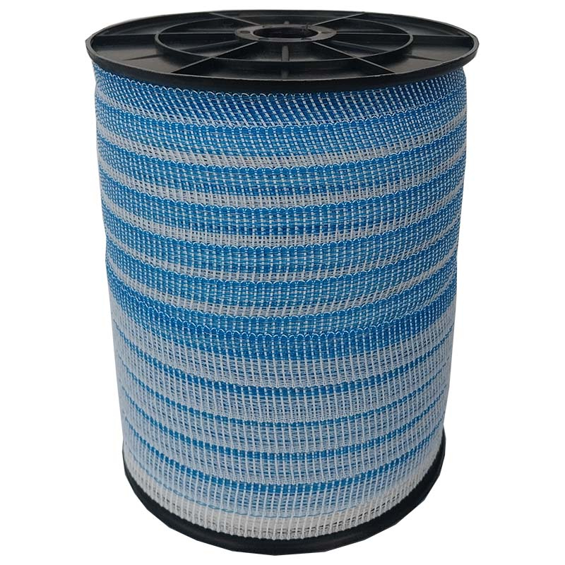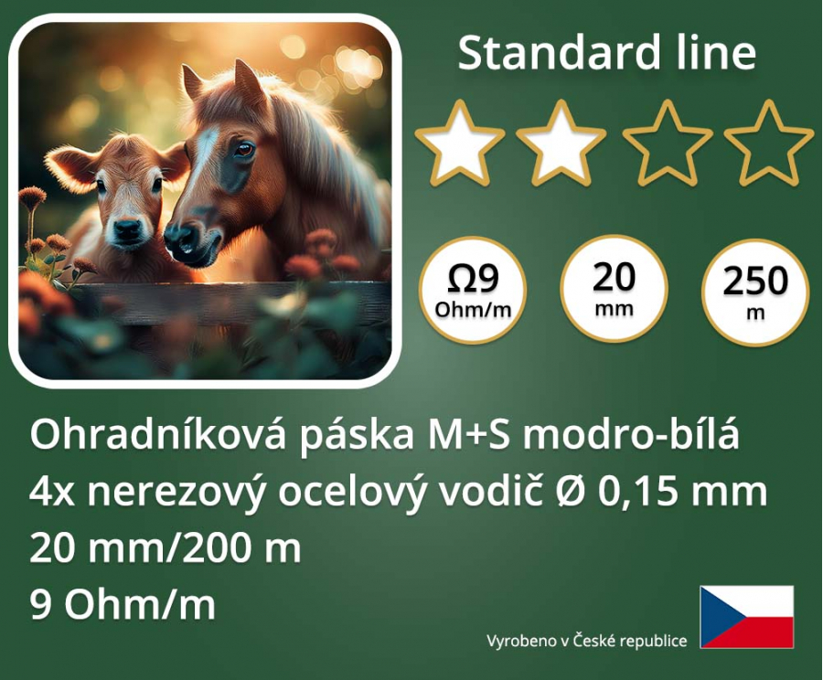 Balení 4+1 ZDARMA - Ohradníková páska Standard line M+S 20 mm/200 m modro-bílá odpor 9 Ohm/m - levná vodivá PE páska na elektrický ohradník s 4x 0,15 mm nerezovým ocelovým vodičem. Měrný odpor elektrické ohradníkové pásky 9 Ohm/m. Vodivá páska pro el. ohradník je určena pro krátké a dočasné ohrady, ale i pro ohrady střední velikost.