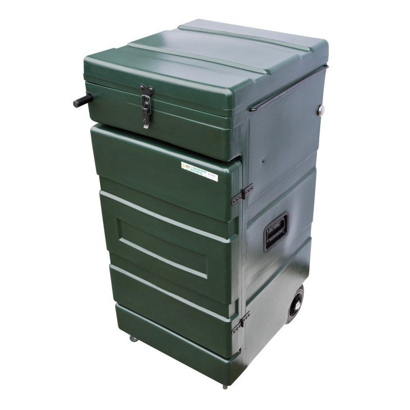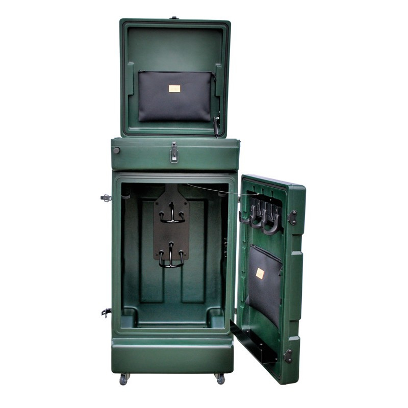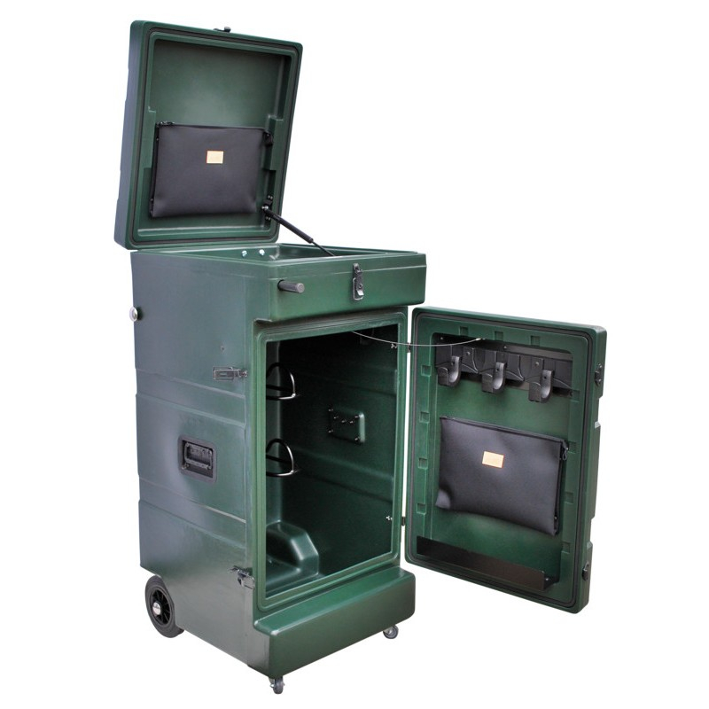 Plastový box, kufr na vybavení pro koně na soutěže La GÉE zelené vertikální provedení s kolečky, řada Premium - vhodný pro uložení sedel, uzdeček, ohlávek, otěží, postrojů, lonží, bot a dalšího potřebného vybavení. Ideální pro cesty na soutěže i jako úložný prostor pro každodení používání. Box je orientován vertikálně a má 4 kolečka, díky kterým je manipulace s ním hračka. Na výrobu tohoto boxu byla použita polyethylenová pryskyřice, která se pyšní značnou odolností proti poškození i vodě. Víko je vybaveno otevíracím pístem, který zabraňuje neplánovanému zabouchnutí víka. Dveře i víko jsou opatřeny těsněním, které zajišťuje úplné utěsnění boxu. Možnost uzamknutí visacím zámkem, který však není součástí dodávky.