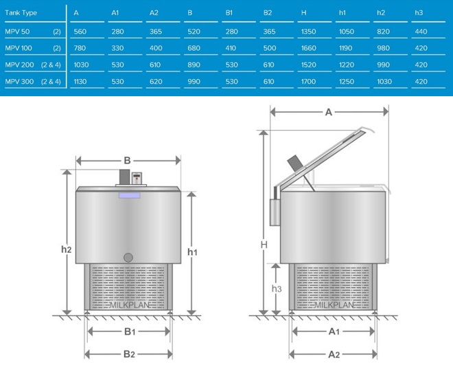 Chladící tank na mléko Milkplan MPV 100 l na chlazení mléka, 2 nádoje, 1 fáze - otevřený chladicí tank o objemu 100 l. Tank je moderní, energeticky úsporný s robustní konstrukcí pro chlazení nadojeného mléka. Tank je konstruován na zpracování dvou nádojů (max. množství mléka najednou nalitého do tanku je polovina jeho pracovního objemu).