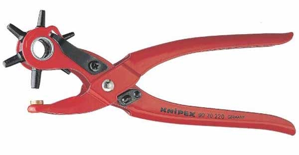 Děrovací kleště na kůži Knipex - děrovačka k vyrážení děr v kůži, textiliích a umělohmotných materiálech, 6 výměnných děrovačů průměr 2,0 / 2,5 / 3,0 / 3,5 / 4,0 / 5,0 mm. S otvírací pružinou a západkou. Děrovač kůže má rukojeti červené s práškovým lakováním. Perforační kleště na děrování kůže.