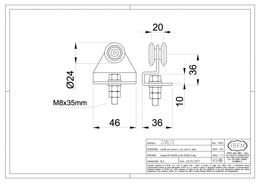 Dvoukolečkový vozík s držákem a závěsem pro kolejnici 339P vozík 338P-2 pro vrata do 60 kg