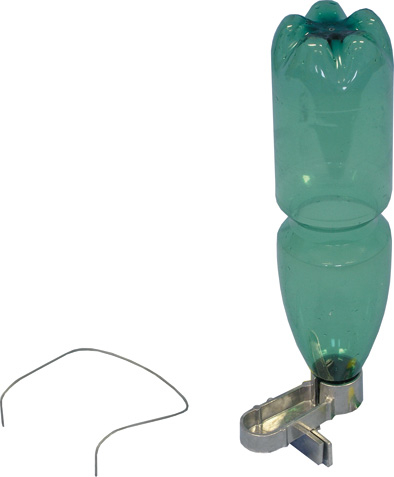 Hladinová napáječka hliníková na PET lahve - hliníková napájecí miska pro chov králíků s příchytkami a drátěným úchytem pro PET lahev.
