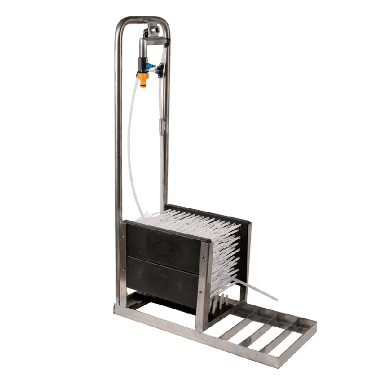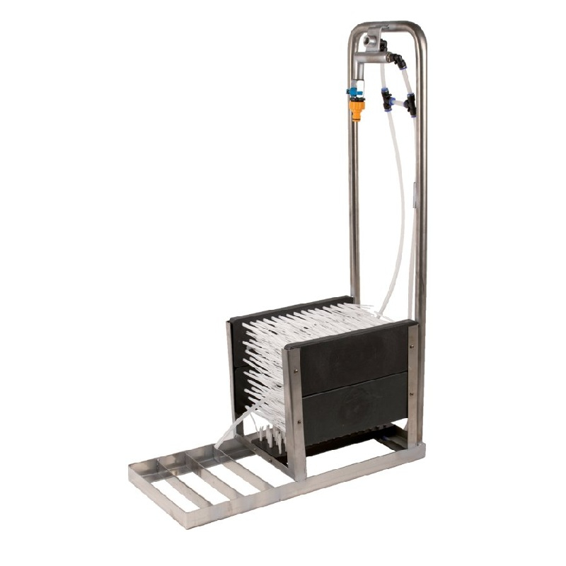 Myčka holínek, čistič na holínky, boty nerezový s 5 kartáči - myčka na holínky se připojuje přímo k vodovodnímu potrubí. Kapalný čistící prostředek je přisávám podtlakem a je automaticky distribuován pomocí 5 nylonových kartáčů.
