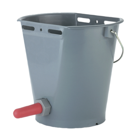 Napájecí kbelík s dudlíkem pro telata - plastové napájecí vědro na mléko 8 l s dudlíkem, zploštělé na obou stranách pro snadné zavěšení, integrovaný dudlík (struk, cucák) s ventilem je součástí dodávky. Držák není součástí balení. Hmotnost 850 g. Ke kbelíku lze dokoupit samostatný dudlík, dudlík s ventilem a držák pro zavěšení.
