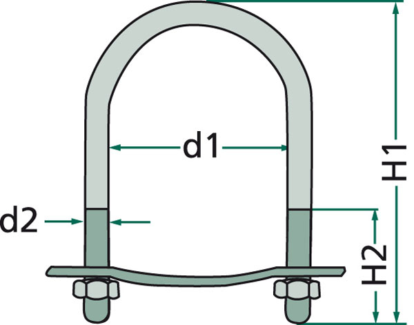 Obloukový šroub s maticemi zinkovaný pro 2 trubky a potrubí o průměru 2 x 1"- d1=50 mm, d2=M 8, H1=80 mm, H2=30 mm, hmotnost 128 g.