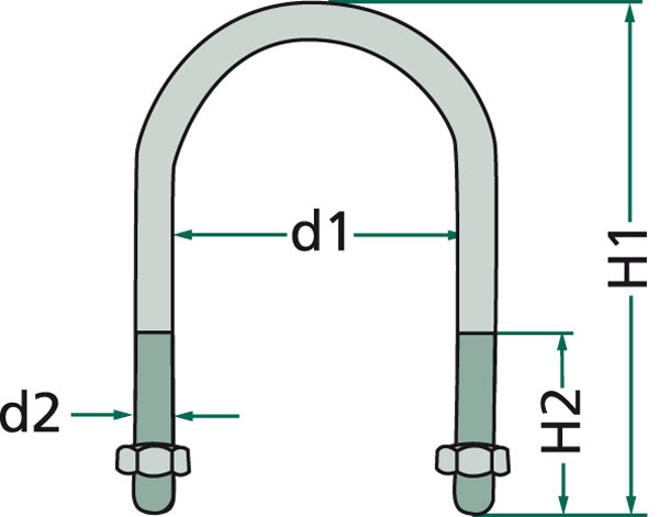 Obloukový šroub s maticemi zinkovaný pro trubku a potrubí o průměru 2" - d1=61mm, d2=M 10, H1=80 mm, H2=35 mm, hmotnost 118 g.