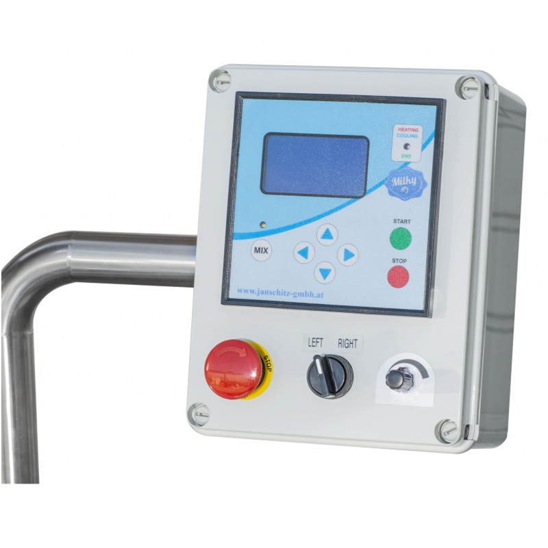 Pasterizační a sýrařský kotel FJ 300 má elektronický ovládací panel pro automatickou regulaci procesu ohřevu a chlazení a 4-cyklový nastavitelný, předprogramovatelný režim.