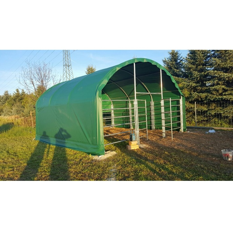 Plachtový přístřešek pro koně, ovce, skot, zvířata 6 x 8 x 3,7 m + plachta 750 g/m2 - přístřešek pro zvířata tvoří kvalitní ocelová konstrukce z pozinku, která je krytá zelenou plachtou (3 strany + střecha). Vstup je možný z přední strany pomocí ocelové brány. Plachta přístřešku je z PVC, který je nepromokavý, UV odolný a má životnost více než 20 let.