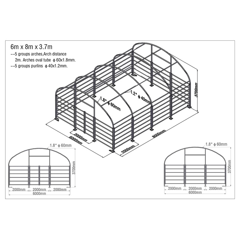 Použité ocelové trubky jsou dimenzovány dle konkrétního rozměru haly. Průměr trubek je přibližně 70 mm × 42 mm a tloušťka stěny činí cca 2 mm (dle typu a velikosti haly).