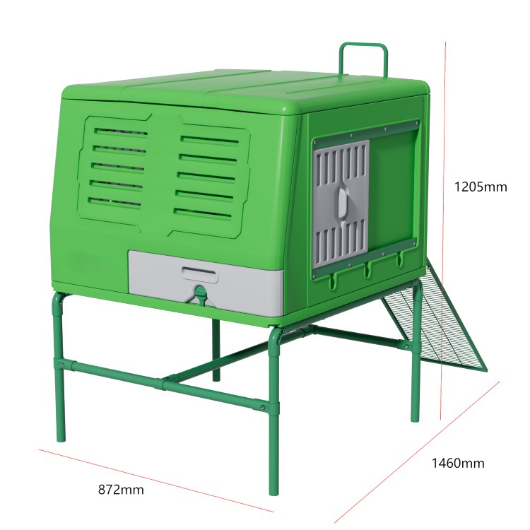 Díky odolné plastové konstrukci je kurník vhodný pro celoroční venkovní použití. Materiál je hygienický, snadno omyvatelný a odolný vůči vlhkosti, mrazu i UV záření. Promyšlené řešení vnitřního prostoru zajišťuje slepicím komfortní zázemí pro snášku i odpočinek.
