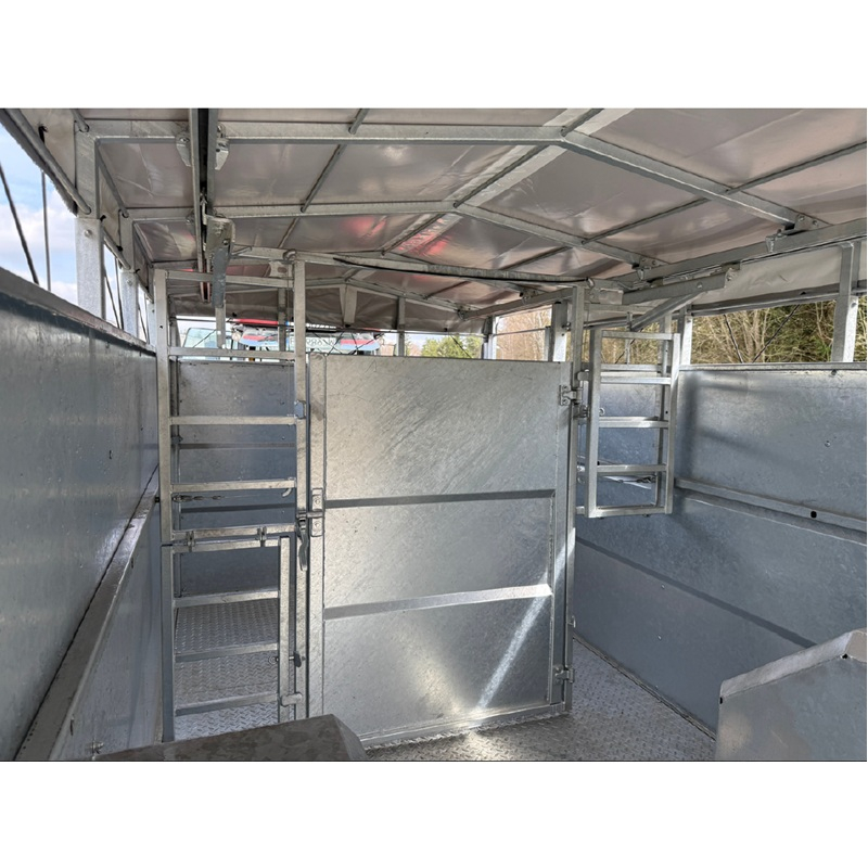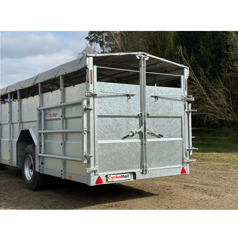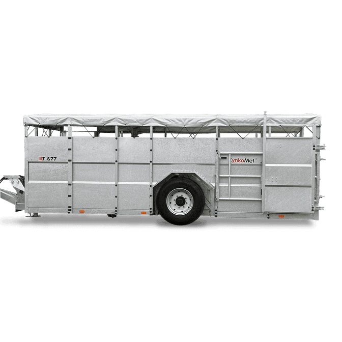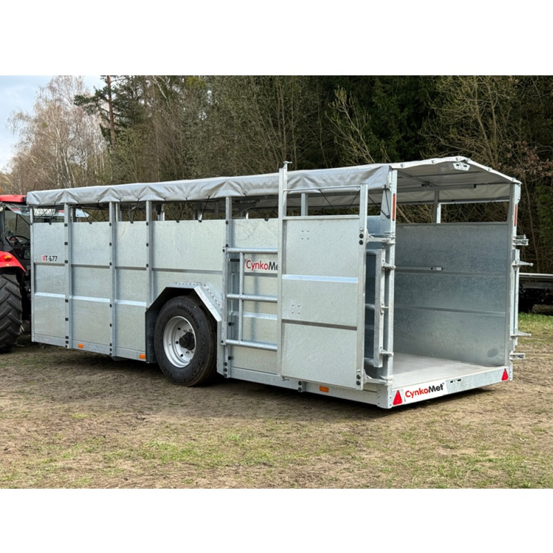 Hydraulicky sklápěný přepravník hospodářských zvířat T-677 H CYNKOMET KURIER H, připojení za traktor - přepravníky zvířat mohou být využity jako přepravník dobytka, přepravník skotu, přepravník na koně, přepravník ovcí. Jednonápravový přepravník skotu, prasat, ovcí, koz a dalšího zvířectva. Použitím hydraulického zavěšení lze rychle snížit výšku podlahy z 680 mm na pouhých 165 mm, což výrazně usnadňuje nakládku a vykládku. Moderní přepravník dobytka má nosnost 7,1 tuny a je vybaven robustním rámem, podlahou z ocelového slzičkového plechu a stěny z 3 mm silného plechu, který je ze žárově pozinkované oceli. To vše zajišťuje dlouhou životnost a bezpečnost. Traktorový přepravník dobytka má homologaci podle předpisů OSN EHK, pneumatické brzdy, LED osvětlení a možnost doplnění o další prvky (např. přepážky, plachty a zábradlí). Tento nový druh přepravníku dobytka je univerzálním řešením pro velké farmy i dopravní společnosti. Uvedení fotografie mají ilustrační charakter.