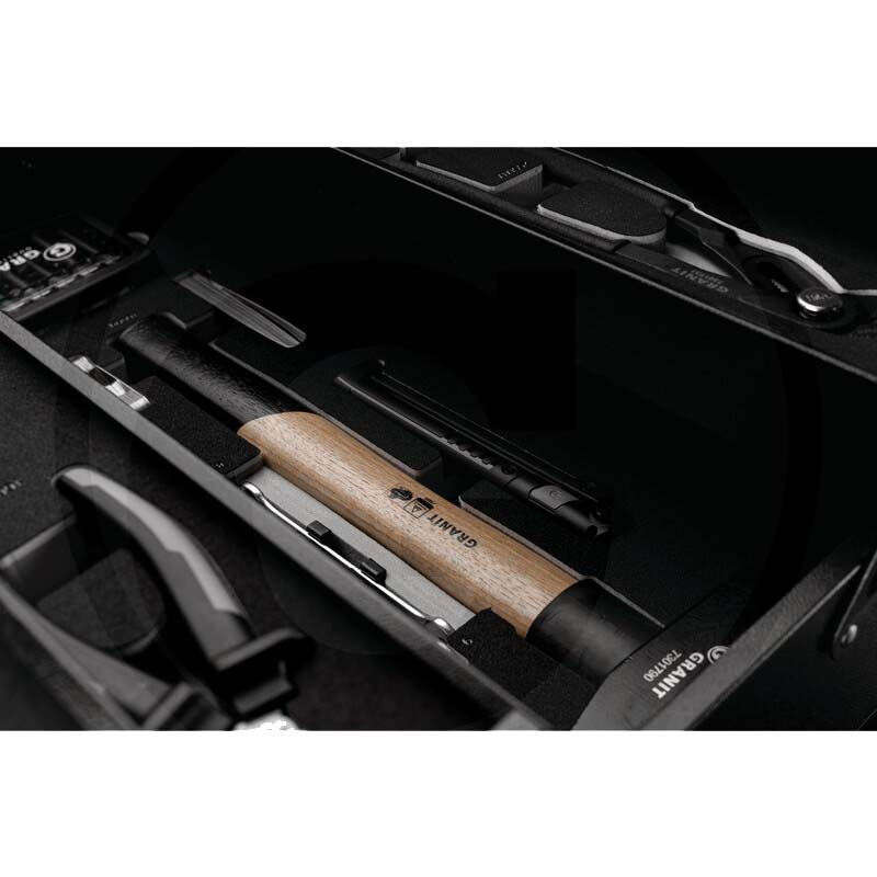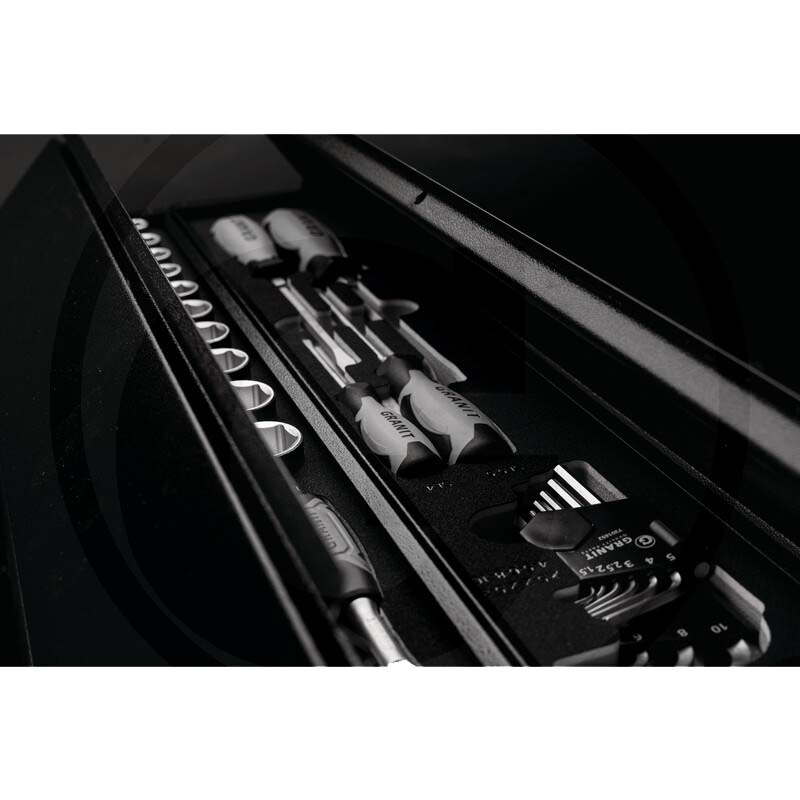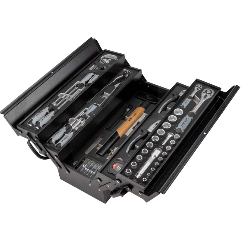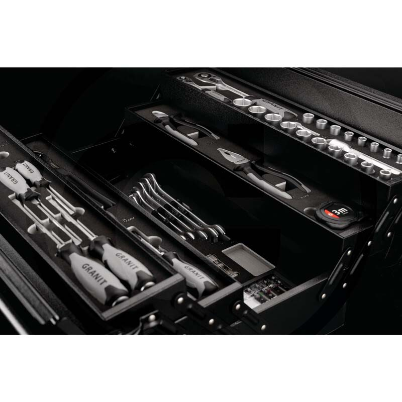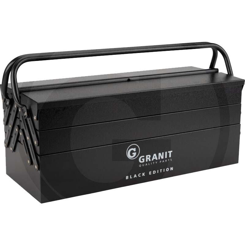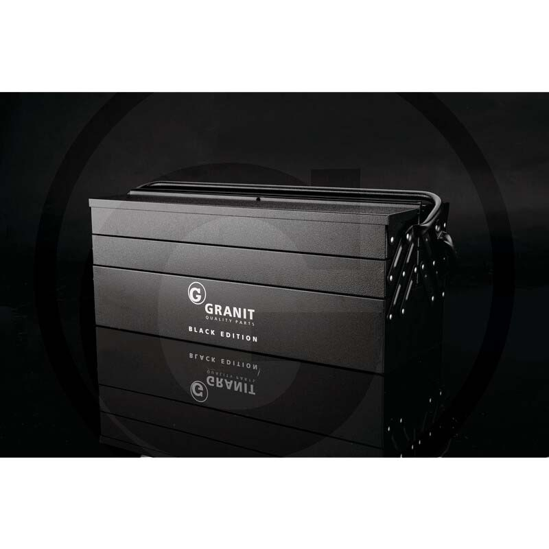 Robustní box na nářadí Black Edition včetně 54 ks nářadí v 5 přihrádkách edice Heavy Duty - skříňka na nářadí s nýtovanými spoji, 5 přihrádek na nářadí, které lze snadno vyjmout. Vysoká stabilita i při vytažení na jednu stranu. Dvě ucha pro přenášení. Celková hmotnost kufru na nářadí je 4,45 kg. Tloušťka použitého materiálu 0,65 mm. Rozměry boxu na nářadí 530 x 200 x 200 mm.