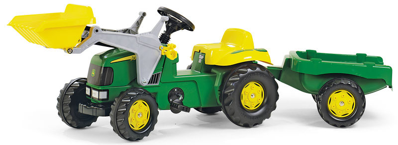 RollyKid - šlapací traktor John Deere s přívěsem a čelním nakladačem modelová řada Rolly Kid, rozměry 1690 x 470 x 550 mm. Snadná ovladatelnost, vysoká kvalita plastu, otevírací kapota motoru. Testováno na zatížení 100 kg.