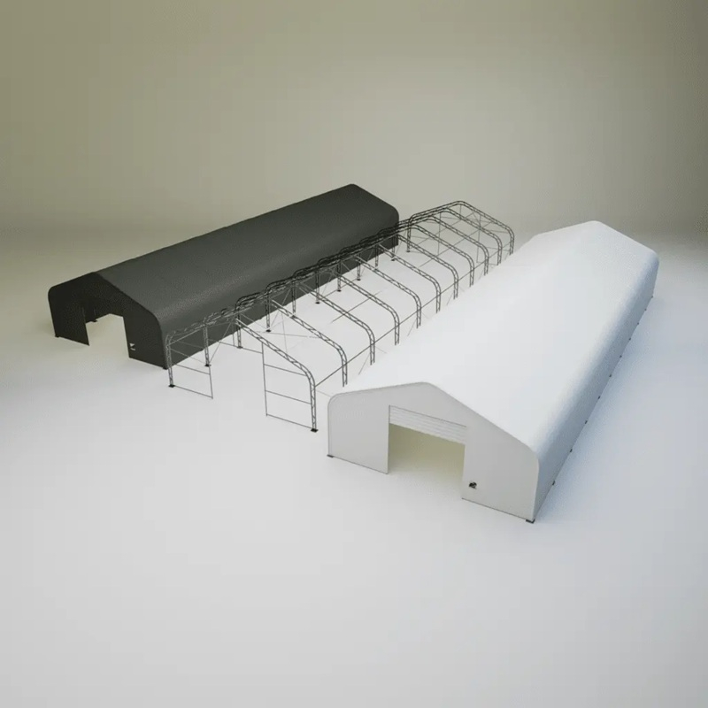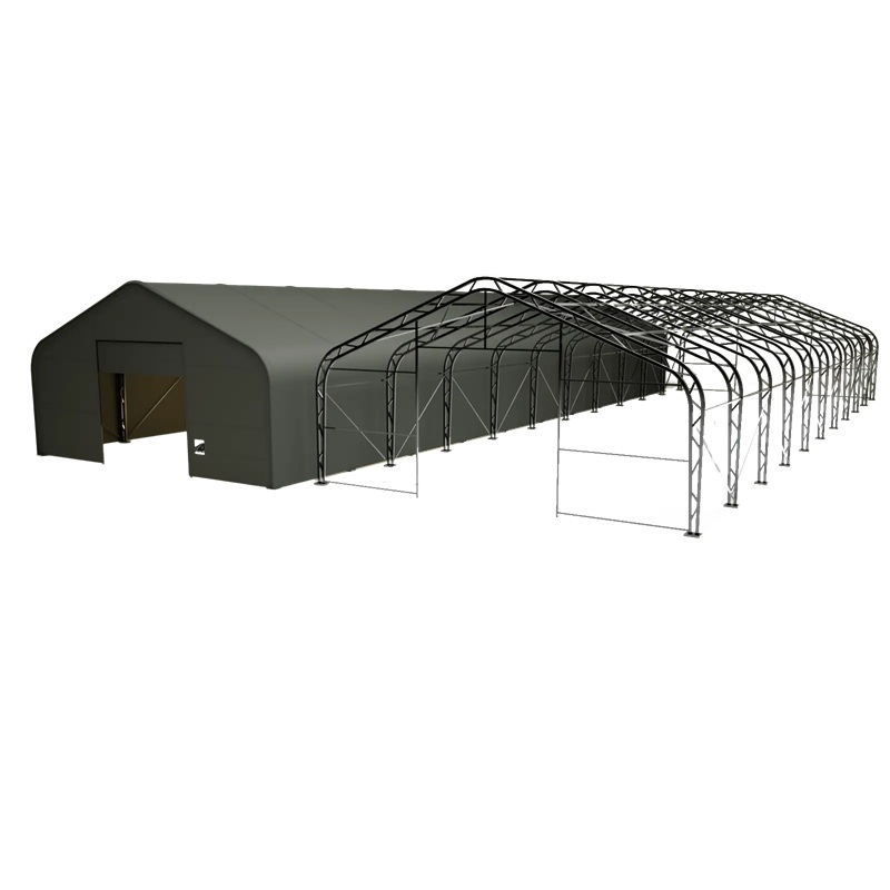 Skladová, stanová hala příhradová konstrukce 10 x 30,5 x 6,1 m + plachta 900 g/m2 - stanová (skladová) hala, známá také jako sedlová hala, disponuje dvojitou pozinkovanou ocelovou konstrukcí, která je kryta vysoce odolnou zelenou nebo bílou PVC plachtou (barvu prosím specifikujte v objednávce). Vstup je možný z přední i zadní strany - otvírání pomocí ručního navijáku (elektrický naviják je za příplatek). Plachta přístřešku je z PVC, který je nepromokavý, UV odolný a má životnost více než 20 let.