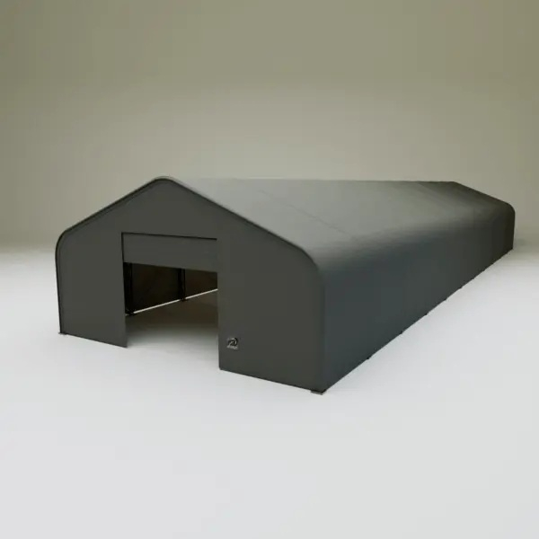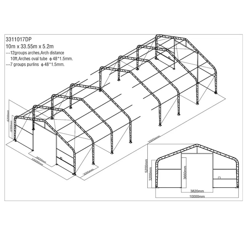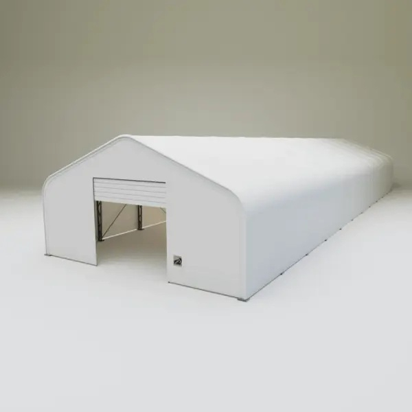 Skladová, stanová hala příhradová konstrukce 10 x 33,55 x 5,2 m + plachta 900 g/m2 - stanová (skladová) hala, známá také jako sedlová hala, disponuje dvojitou pozinkovanou ocelovou konstrukcí, která je kryta vysoce odolnou zelenou nebo bílou PVC plachtou (barvu prosím specifikujte v objednávce). Vstup je možný z přední i zadní strany - otvírání pomocí ručního navijáku (elektrický naviják je za příplatek). Plachta přístřešku je z PVC, který je nepromokavý, UV odolný a má životnost více než 20 let.