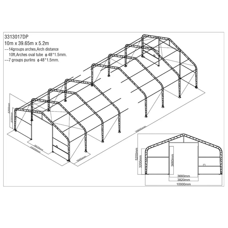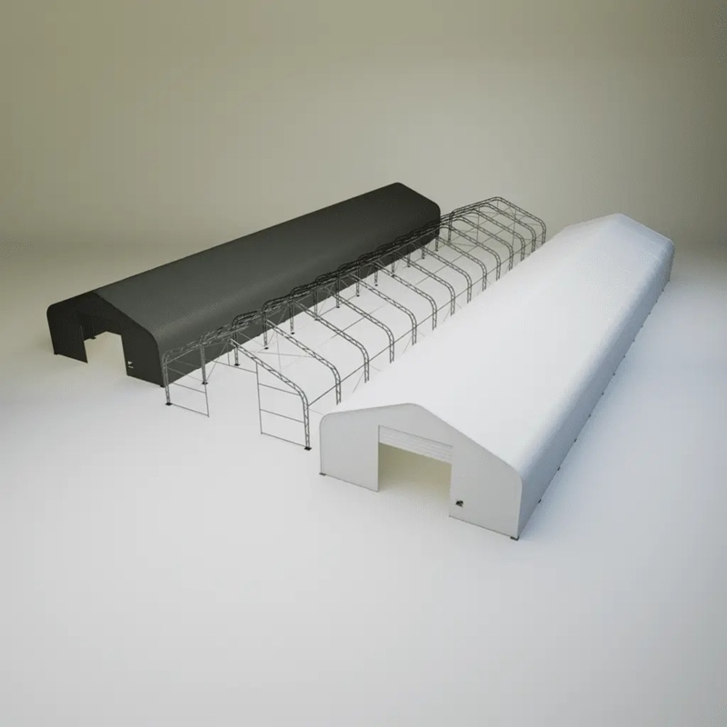 Skladová, stanová hala příhradová konstrukce 10 x 39,65 x 5,2 m + plachta 900 g/m2 - stanová (skladová) hala, známá také jako sedlová hala, disponuje dvojitou pozinkovanou ocelovou konstrukcí, která je kryta vysoce odolnou zelenou nebo bílou PVC plachtou (barvu prosím specifikujte v objednávce). Vstup je možný z přední i zadní strany - otvírání pomocí ručního navijáku (elektrický naviják je za příplatek). Plachta přístřešku je z PVC, který je nepromokavý, UV odolný a má životnost více než 20 let.