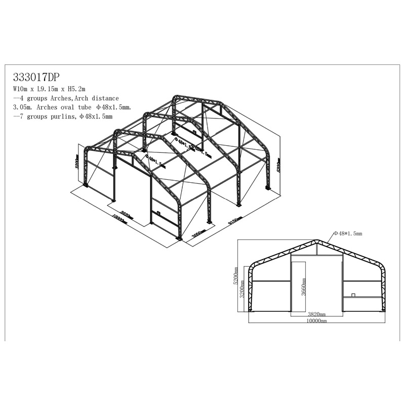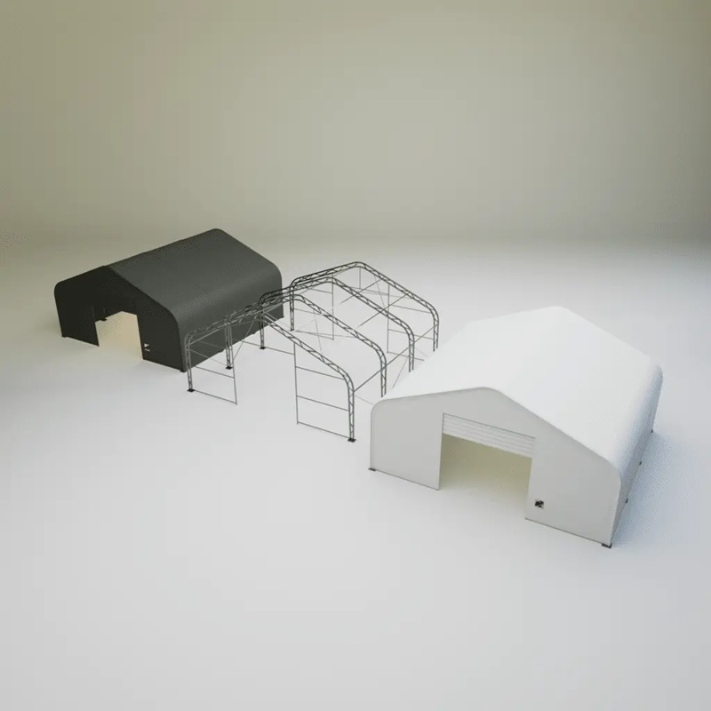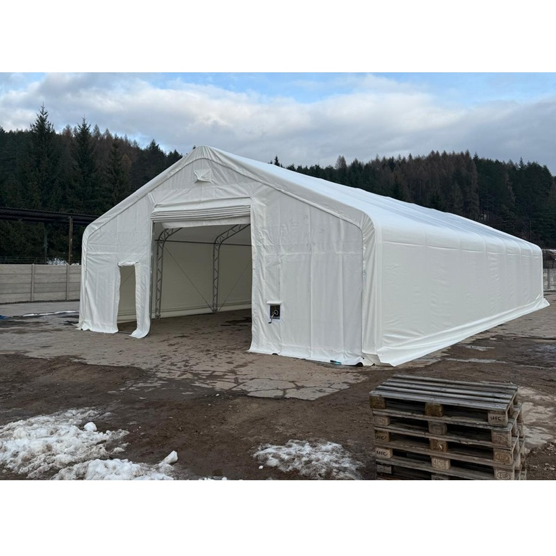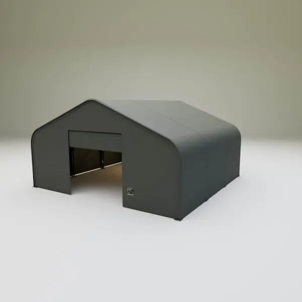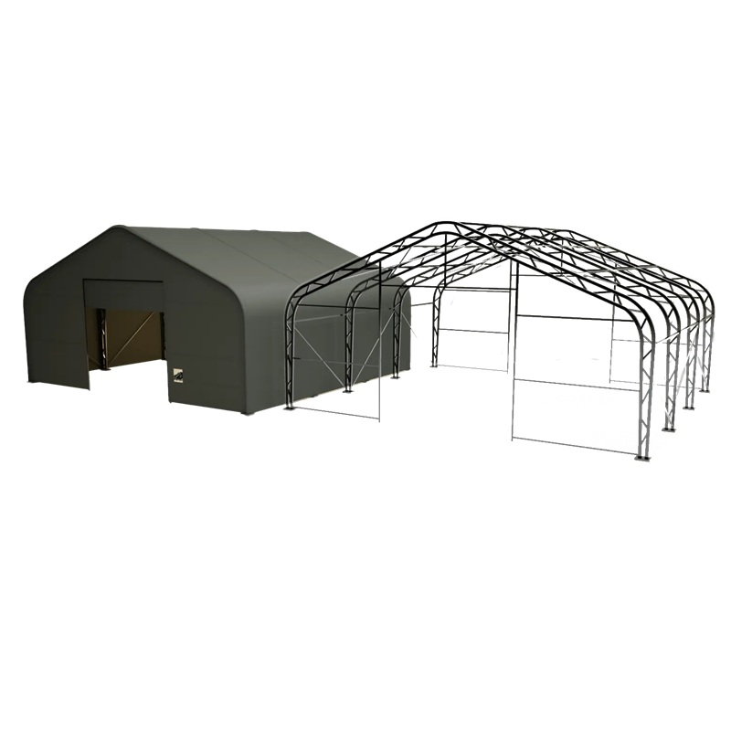 Skladová, stanová hala příhradová konstrukce 10 x 9,15 x 5,2 m + plachta 900 g/m2 - stanová (skladová) hala, známá také jako sedlová hala, disponuje dvojitou pozinkovanou ocelovou konstrukcí, která je kryta vysoce odolnou zelenou nebo bílou PVC plachtou (barvu prosím specifikujte v objednávce). Vstup je možný z přední i zadní strany - otvírání pomocí ručního navijáku (elektrický naviják je za příplatek). Plachta přístřešku je z PVC, který je nepromokavý, UV odolný a má životnost více než 20 let.