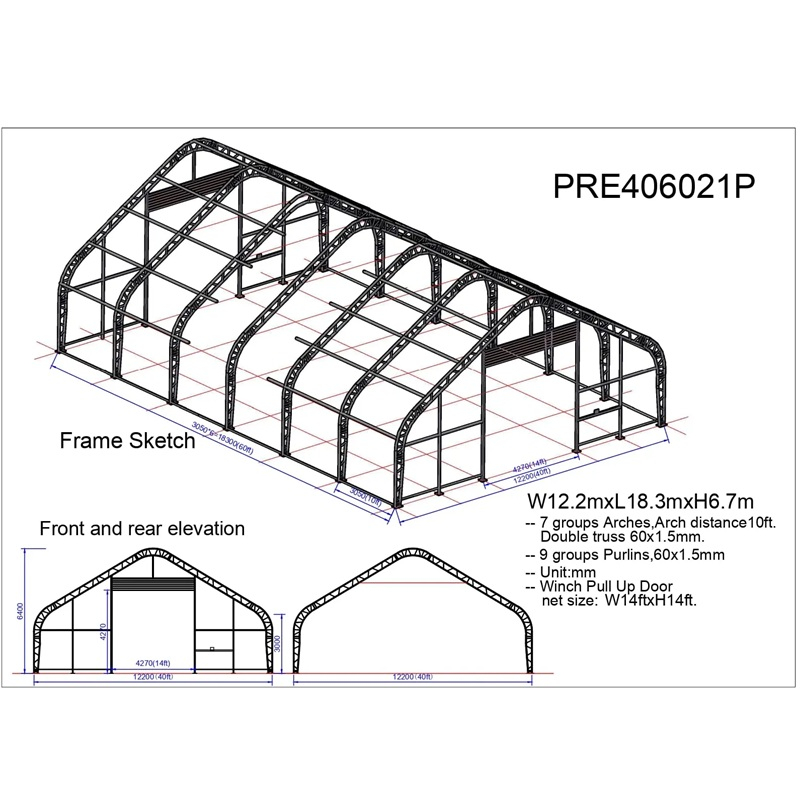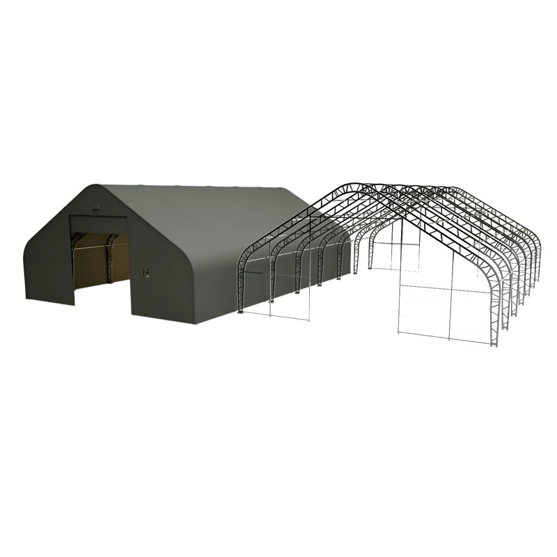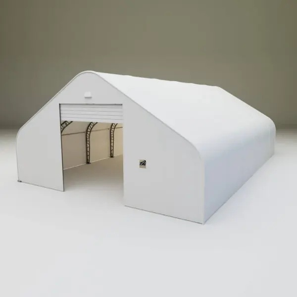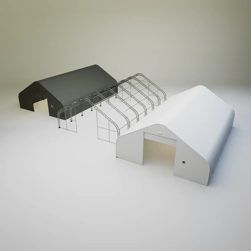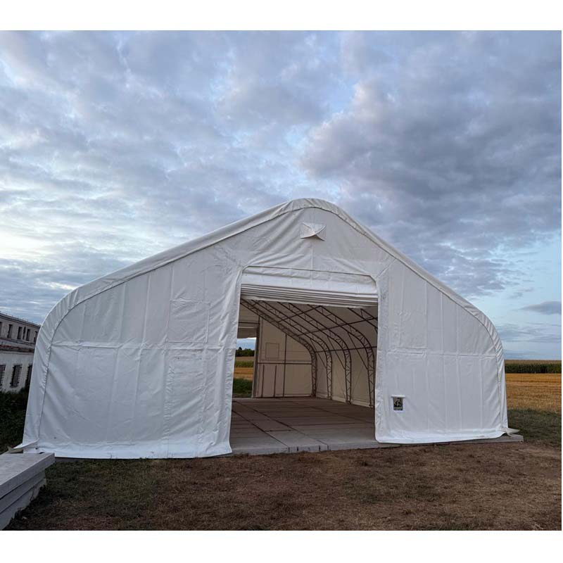 Skladová, stanová hala příhradová konstrukce 12,2 x 18,30 x 6,4 m + plachta 900 g/m2 - stanová (skladová) hala, známá také jako sedlová hala, disponuje dvojitou pozinkovanou ocelovou konstrukcí, která je kryta vysoce odolnou zelenou nebo bílou PVC plachtou (barvu prosím specifikujte v objednávce). Vstup je možný z přední i zadní strany - otvírání pomocí ručního navijáku (elektrický naviják je za příplatek). Plachta přístřešku je z PVC, který je nepromokavý, UV odolný a má životnost více než 20 let.
