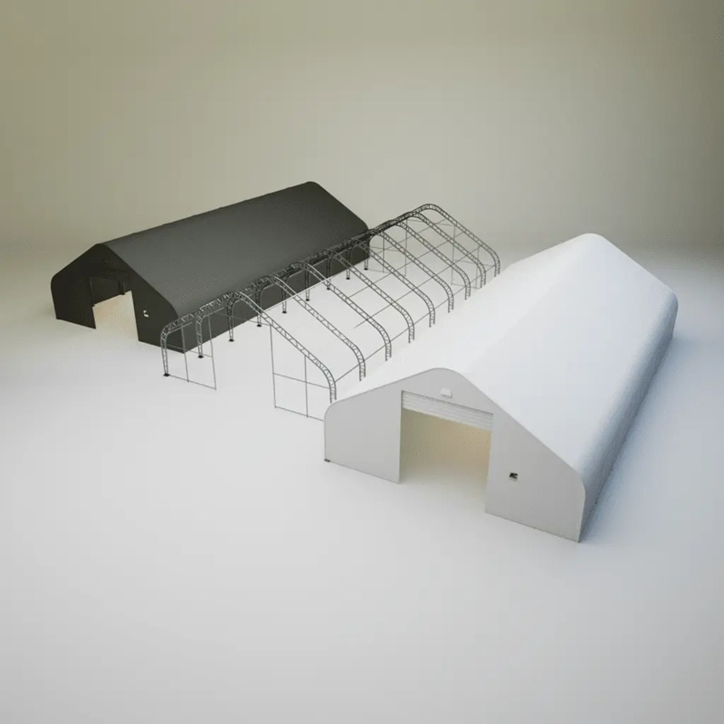 Skladová, stanová hala příhradová konstrukce 12,2 x 21,35 x 6,4 m + plachta 900 g/m2 - stanová (skladová) hala, známá také jako sedlová hala, disponuje dvojitou pozinkovanou ocelovou konstrukcí, která je kryta vysoce odolnou zelenou nebo bílou PVC plachtou (barvu prosím specifikujte v objednávce). Vstup je možný z přední i zadní strany - otvírání pomocí ručního navijáku (elektrický naviják je za příplatek). Plachta přístřešku je z PVC, který je nepromokavý, UV odolný a má životnost více než 20 let.