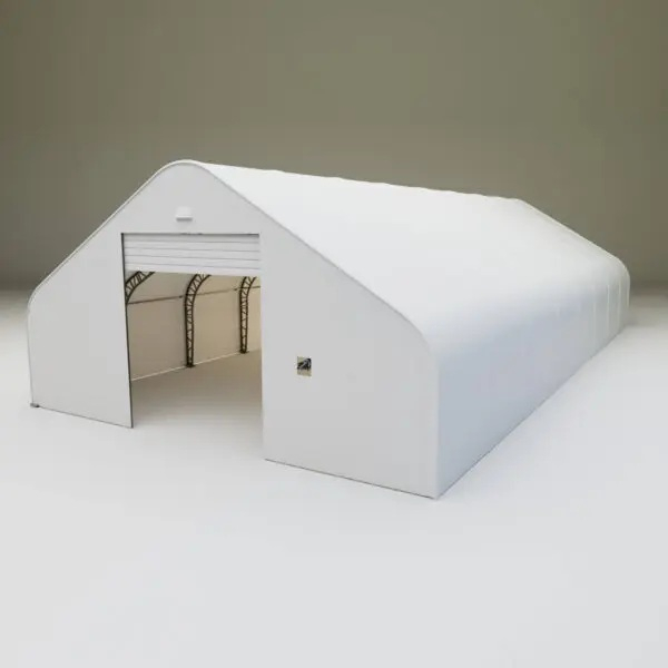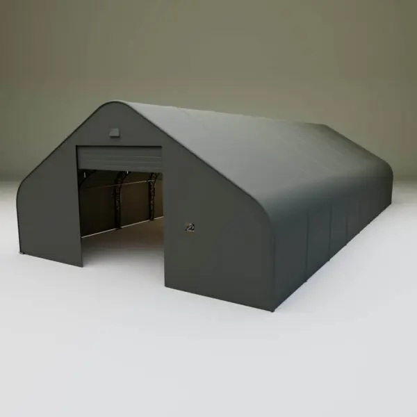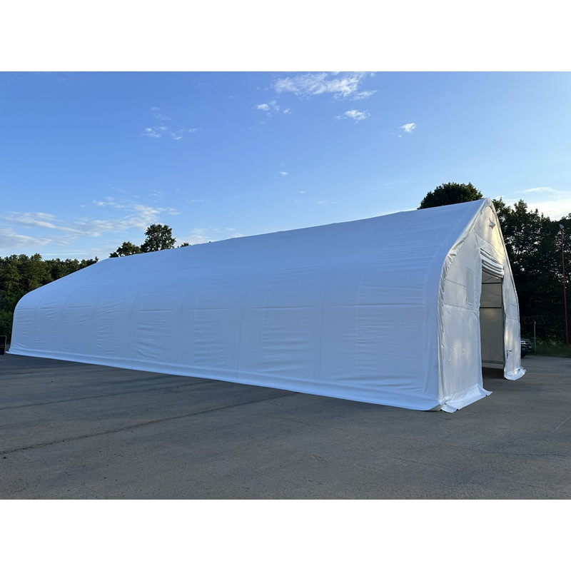 Skladová, stanová hala příhradová konstrukce 12,2 x 24,4 x 6,4 m + plachta 900 g/m2 - stanová (skladová) hala, známá také jako sedlová hala, disponuje dvojitou pozinkovanou ocelovou konstrukcí, která je kryta vysoce odolnou zelenou nebo bílou PVC plachtou (barvu prosím specifikujte v objednávce). Vstup je možný z přední i zadní strany - otvírání pomocí ručního navijáku (elektrický naviják je za příplatek). Plachta přístřešku je z PVC, který je nepromokavý, UV odolný a má životnost více než 20 let.