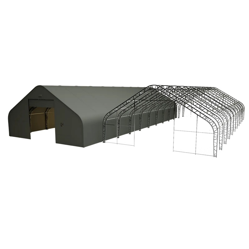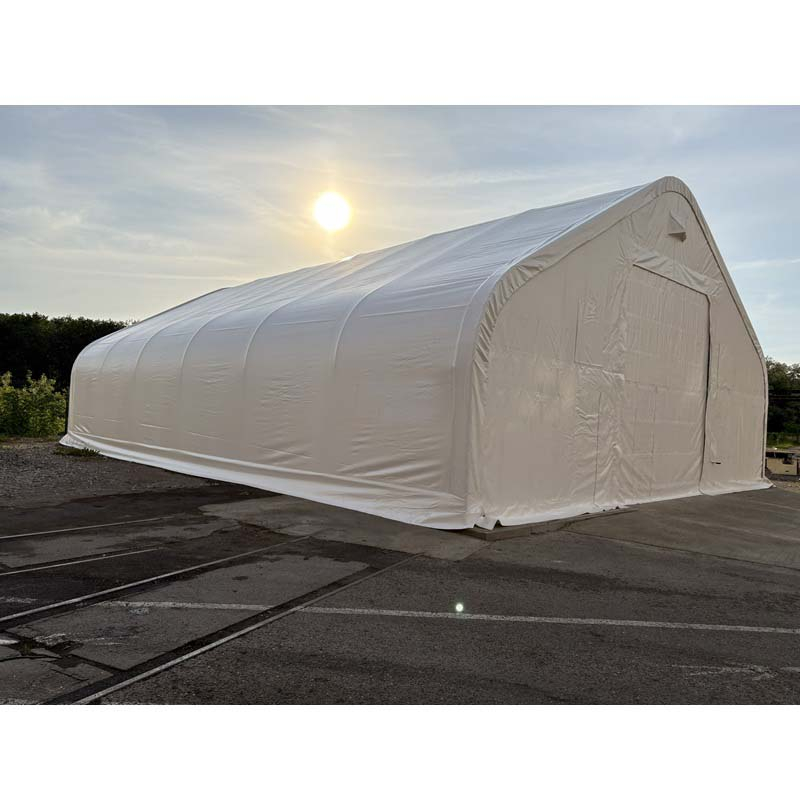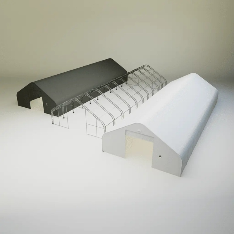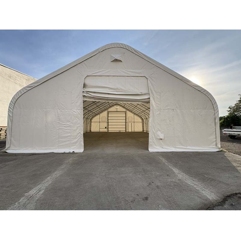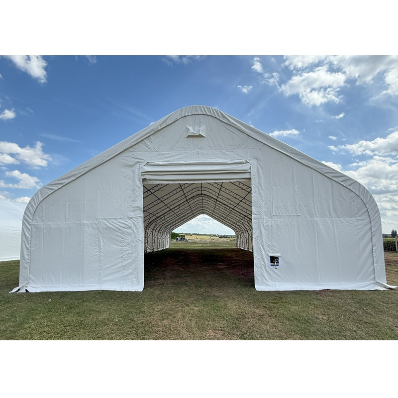 Skladová, stanová hala příhradová konstrukce 12,2 x 30,5 x 6,4 m + plachta 900 g/m2 - stanová (skladová) hala, známá také jako sedlová hala, disponuje dvojitou pozinkovanou ocelovou konstrukcí, která je kryta vysoce odolnou zelenou nebo bílou PVC plachtou (barvu prosím specifikujte v objednávce). Vstup je možný z přední i zadní strany - otvírání pomocí ručního navijáku (elektrický naviják je za příplatek). Plachta přístřešku je z PVC, který je nepromokavý, UV odolný a má životnost více než 20 let.