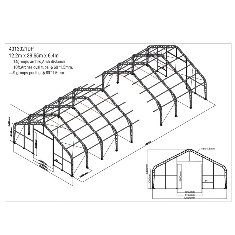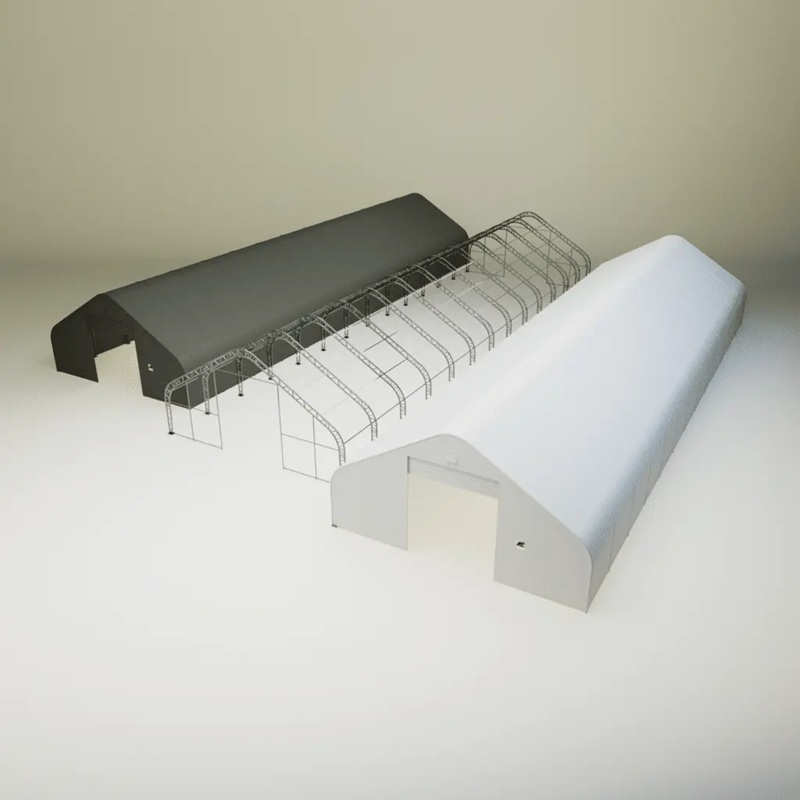 Skladová, stanová hala příhradová konstrukce 12,2 x 39,65 x 6,4 m + plachta 900 g/m2 - stanová (skladová) hala, známá také jako sedlová hala, disponuje dvojitou pozinkovanou ocelovou konstrukcí, která je kryta vysoce odolnou zelenou nebo bílou PVC plachtou (barvu prosím specifikujte v objednávce). Vstup je možný z přední i zadní strany - otvírání pomocí ručního navijáku (elektrický naviják je za příplatek). Plachta přístřešku je z PVC, který je nepromokavý, UV odolný a má životnost více než 20 let.