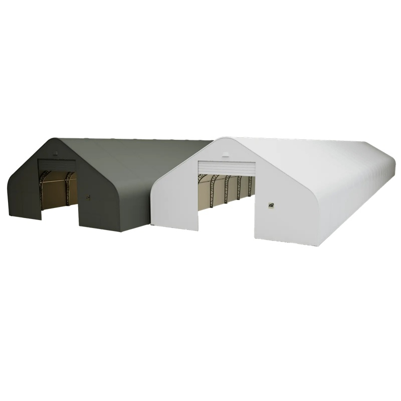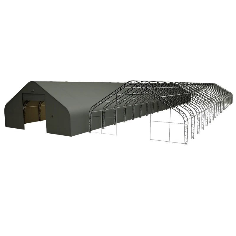 Skladová, stanová hala příhradová konstrukce 12,2 x 57,95 x 6,4 m + plachta 900 g/m2 - stanová (skladová) hala, známá také jako sedlová hala, disponuje dvojitou pozinkovanou ocelovou konstrukcí, která je kryta vysoce odolnou zelenou nebo bílou PVC plachtou (barvu prosím specifikujte v objednávce). Vstup je možný z přední i zadní strany - otvírání pomocí ručního navijáku (elektrický naviják je za příplatek). Plachta přístřešku je z PVC, který je nepromokavý, UV odolný a má životnost více než 20 let.
