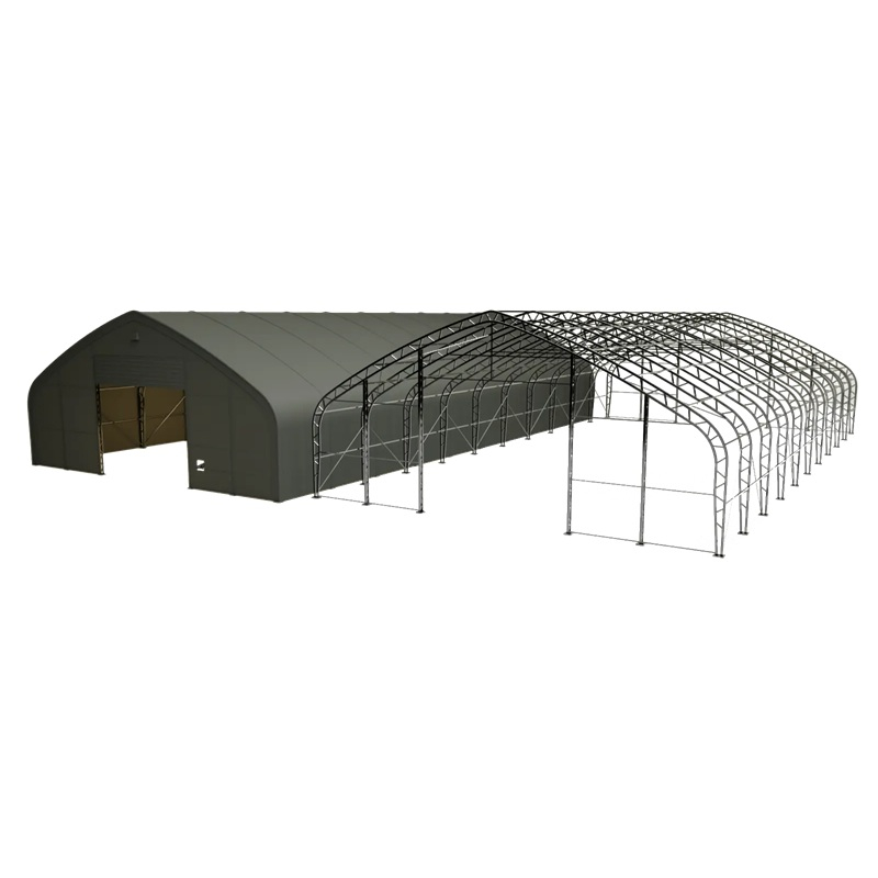 Skladová, stanová hala příhradová konstrukce 15,25 x 24,4 x 7 m + plachta 900 g/m2 - stanová (skladová) hala, známá také jako sedlová hala, disponuje dvojitou pozinkovanou ocelovou konstrukcí, která je kryta vysoce odolnou zelenou nebo bílou PVC plachtou (barvu prosím specifikujte v objednávce). Vstup je možný z přední i zadní strany - otvírání pomocí ručního navijáku (elektrický naviják je za příplatek). Plachta přístřešku je z PVC, který je nepromokavý, UV odolný a má životnost více než 20 let.