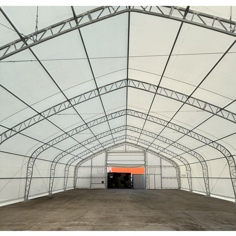 Skladová, stanová hala příhradová konstrukce 18,3 x 21,96 x 7,63 m + plachta 900 g/m2 - stanová (skladová) hala, známá také jako sedlová hala, disponuje dvojitou pozinkovanou ocelovou konstrukcí, která je kryta vysoce odolnou zelenou nebo bílou PVC plachtou (barvu prosím specifikujte v objednávce). Vstup je možný z přední i zadní strany - otvírání pomocí ručního navijáku (elektrický naviják je za příplatek). Plachta přístřešku je z PVC, který je nepromokavý, UV odolný a má životnost více než 20 let.