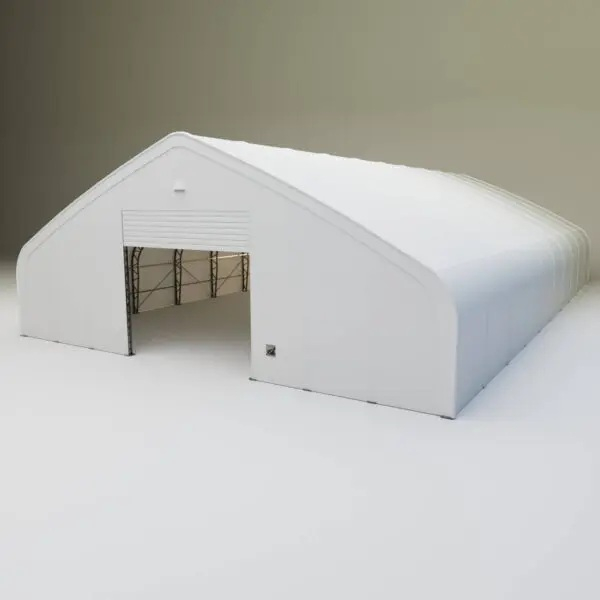 Skladová, stanová hala příhradová konstrukce 18,3 x 39,04 x 7,63 m + plachta 900 g/m2 - stanová (skladová) hala, známá také jako sedlová hala, disponuje dvojitou pozinkovanou ocelovou konstrukcí, která je kryta vysoce odolnou zelenou nebo bílou PVC plachtou (barvu prosím specifikujte v objednávce). Vstup je možný z přední i zadní strany - otvírání pomocí ručního navijáku (elektrický naviják je za příplatek). Plachta přístřešku je z PVC, který je nepromokavý, UV odolný a má životnost více než 20 let.