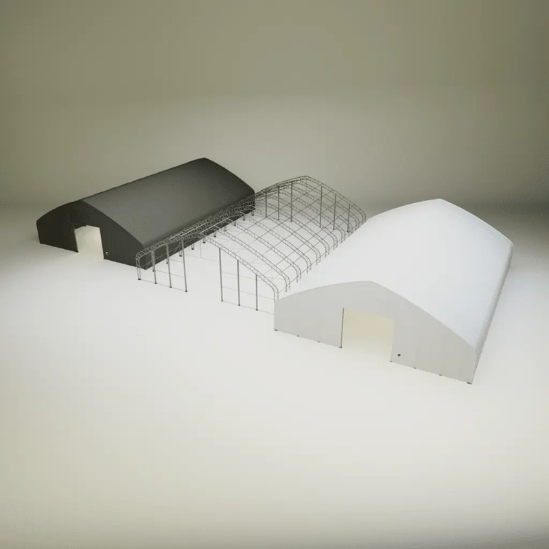 Skladová, stanová hala příhradová konstrukce 21,35 x 41,48 x 8,54 m + plachta 900 g/m2 - stanová (skladová) hala, známá také jako sedlová hala, disponuje dvojitou pozinkovanou ocelovou konstrukcí, která je kryta vysoce odolnou zelenou nebo bílou PVC plachtou (barvu prosím specifikujte v objednávce). Vstup je možný z přední i zadní strany - otvírání pomocí ručního navijáku (elektrický naviják je za příplatek). Plachta přístřešku je z PVC, který je nepromokavý, UV odolný a má životnost více než 20 let.