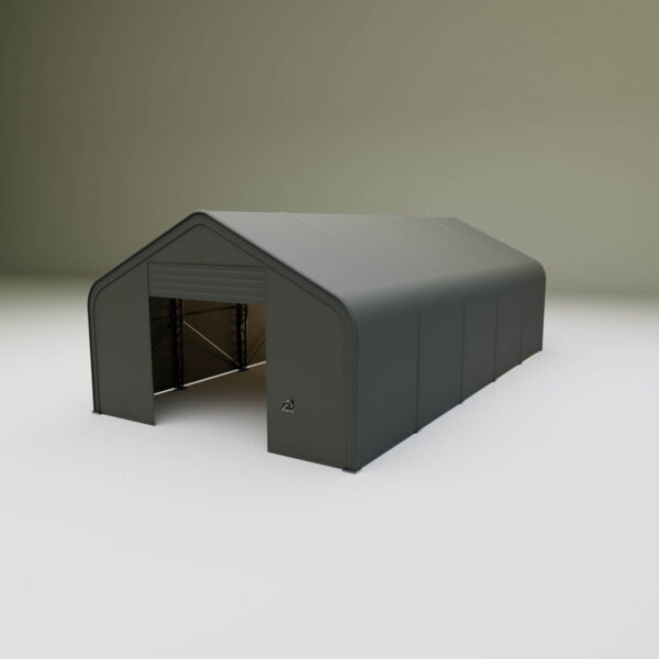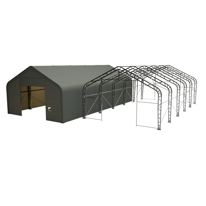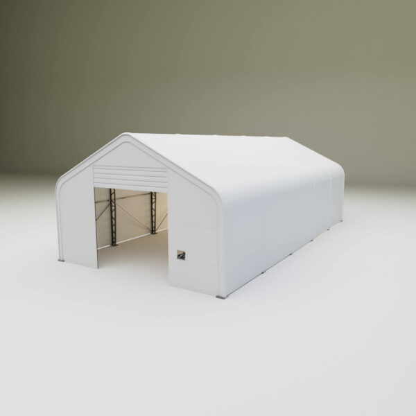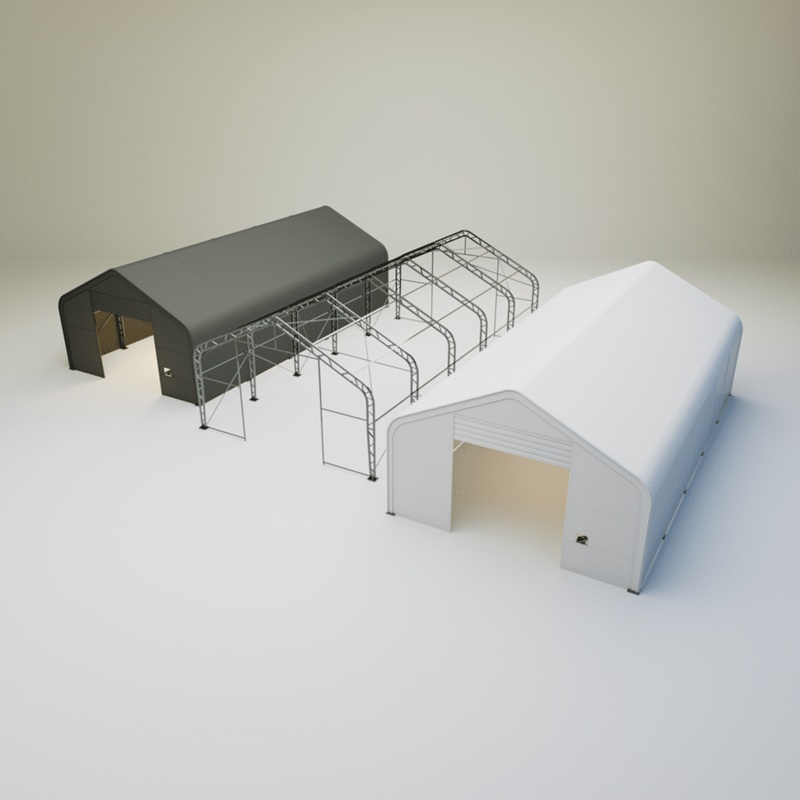 Skladová, stanová hala příhradová konstrukce 8 x 15,25 x 5,2 m + plachta 900 g/m2 - stanová (skladová) hala, známá také jako sedlová hala, disponuje dvojitou pozinkovanou ocelovou konstrukcí, která je kryta vysoce odolnou zelenou nebo bílou PVC plachtou (barvu prosím specifikujte v objednávce). Vstup je možný z přední i zadní strany - otvírání pomocí ručního navijáku (elektrický naviják je za příplatek). Plachta přístřešku je z PVC, který je nepromokavý, UV odolný a má životnost více než 20 let.