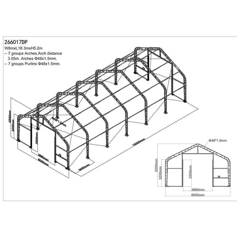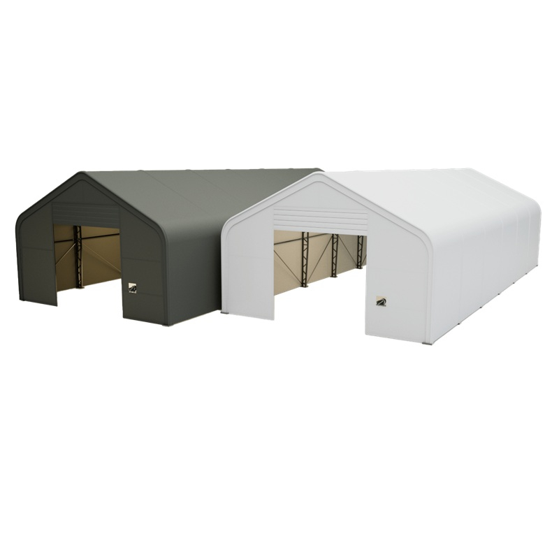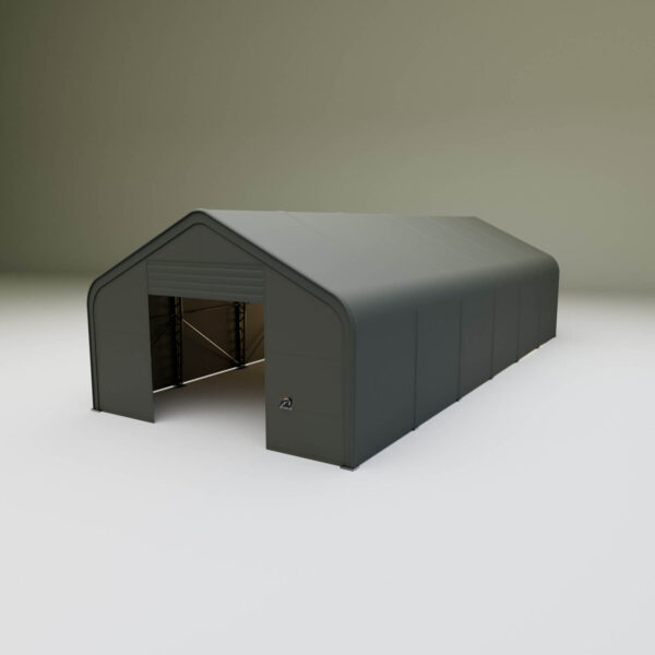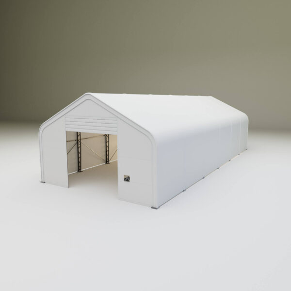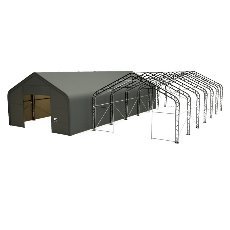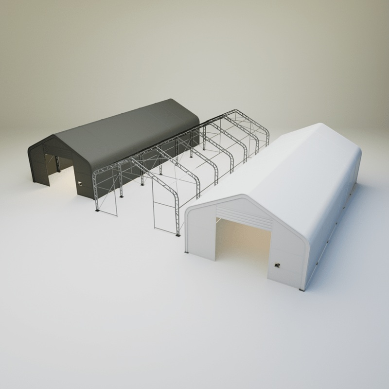 Skladová, stanová hala příhradová konstrukce 8 x 18,3 x 5,2 m + plachta 900 g/m2 - stanová (skladová) hala, známá také jako sedlová hala, disponuje dvojitou pozinkovanou ocelovou konstrukcí, která je kryta vysoce odolnou zelenou nebo bílou PVC plachtou (barvu prosím specifikujte v objednávce). Vstup je možný z přední i zadní strany - otvírání pomocí ručního navijáku (elektrický naviják je za příplatek). Plachta přístřešku je z PVC, který je nepromokavý, UV odolný a má životnost více než 20 let.