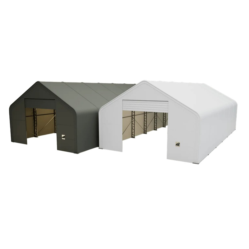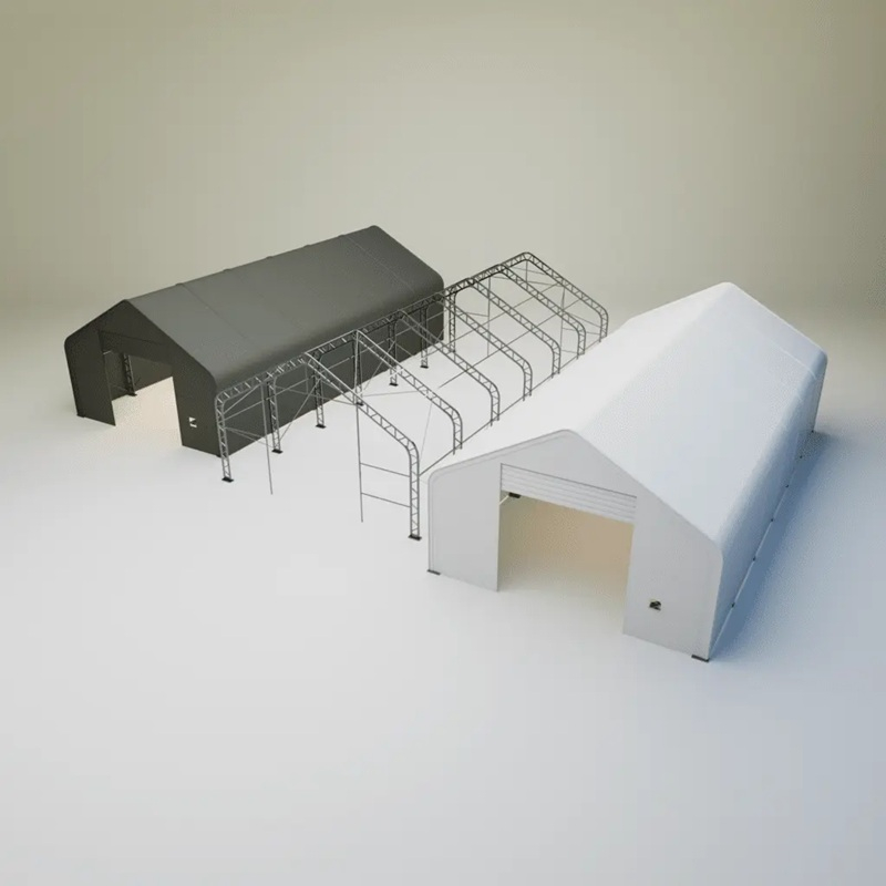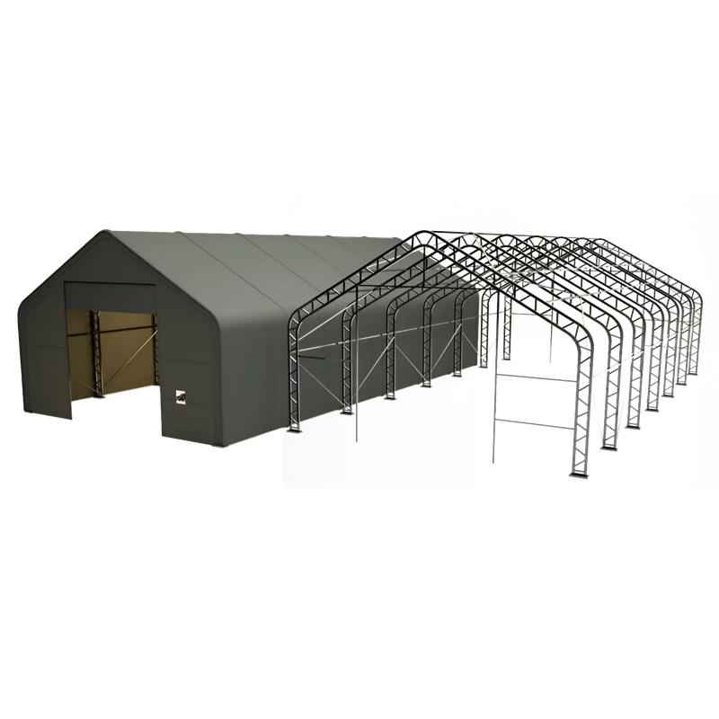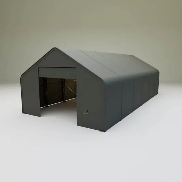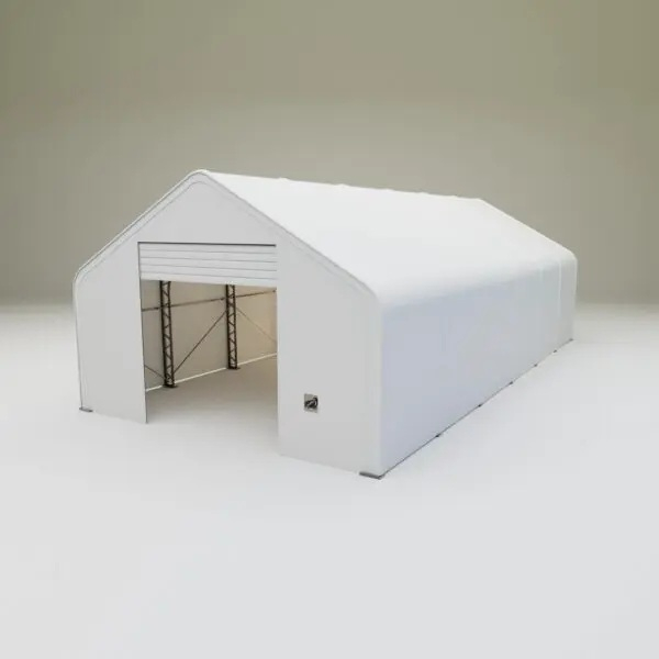 Skladová, stanová hala příhradová konstrukce 9,15 x 18,3 x 6,1 m + plachta 900 g/m2 - stanová (skladová) hala, známá také jako sedlová hala, disponuje dvojitou pozinkovanou ocelovou konstrukcí, která je kryta vysoce odolnou zelenou nebo bílou PVC plachtou (barvu prosím specifikujte v objednávce). Vstup je možný z přední i zadní strany - otvírání pomocí ručního navijáku (elektrický naviják je za příplatek). Plachta přístřešku je z PVC, který je nepromokavý, UV odolný a má životnost více než 20 let.