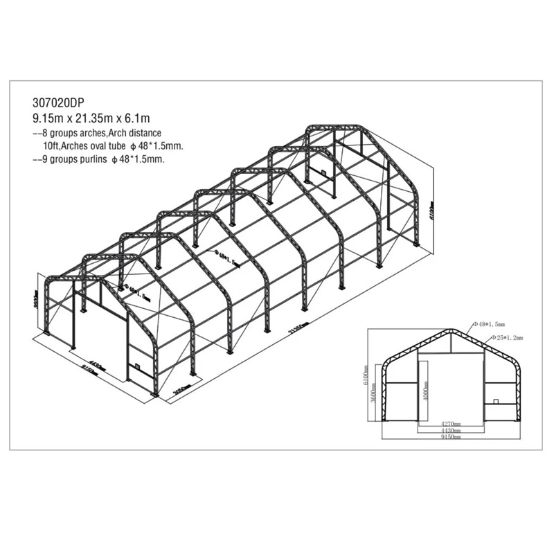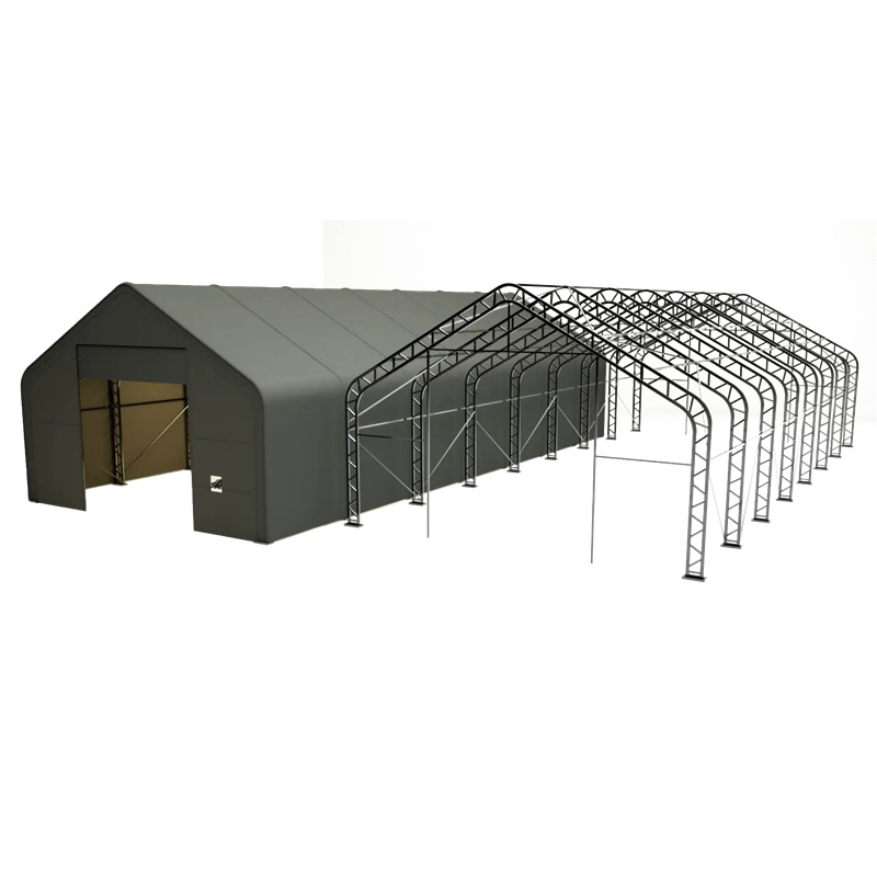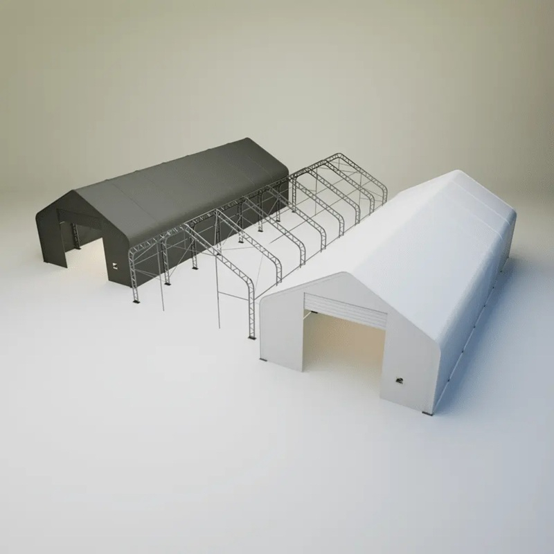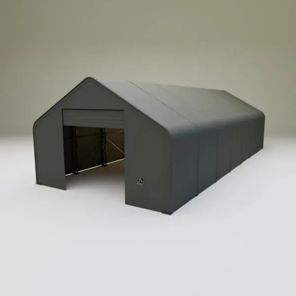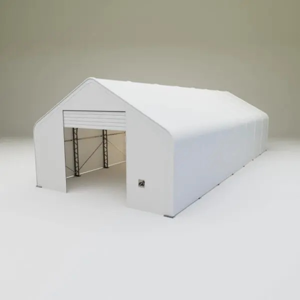 Skladová, stanová hala příhradová konstrukce 9,15 x 21,35 x 6,1 m + plachta 900 g/m2 - stanová (skladová) hala, známá také jako sedlová hala, disponuje dvojitou pozinkovanou ocelovou konstrukcí, která je kryta vysoce odolnou zelenou nebo bílou PVC plachtou (barvu prosím specifikujte v objednávce). Vstup je možný z přední i zadní strany - otvírání pomocí ručního navijáku (elektrický naviják je za příplatek). Plachta přístřešku je z PVC, který je nepromokavý, UV odolný a má životnost více než 20 let.