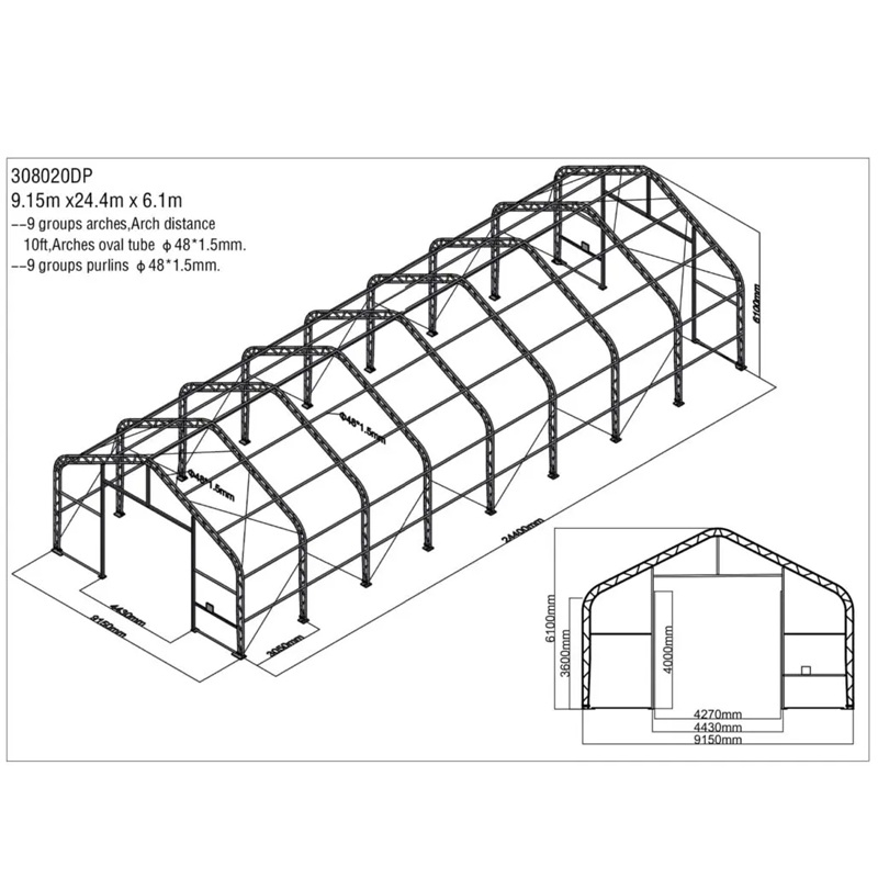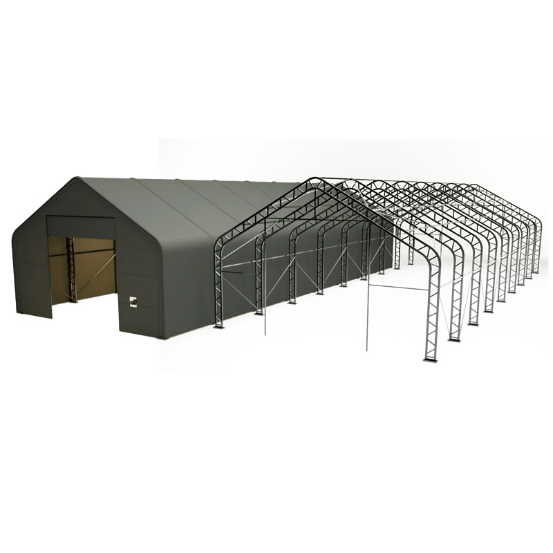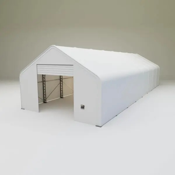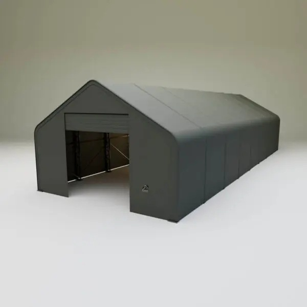 Skladová, stanová hala příhradová konstrukce 9,15 x 24,4 x 6,1 m + plachta 900 g/m2 - stanová (skladová) hala, známá také jako sedlová hala, disponuje dvojitou pozinkovanou ocelovou konstrukcí, která je kryta vysoce odolnou zelenou nebo bílou PVC plachtou (barvu prosím specifikujte v objednávce). Vstup je možný z přední i zadní strany - otvírání pomocí ručního navijáku (elektrický naviják je za příplatek). Plachta přístřešku je z PVC, který je nepromokavý, UV odolný a má životnost více než 20 let.