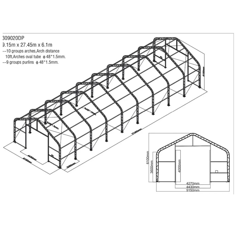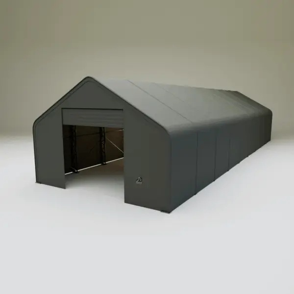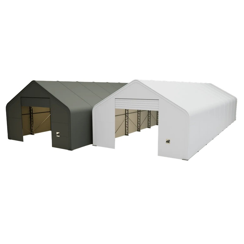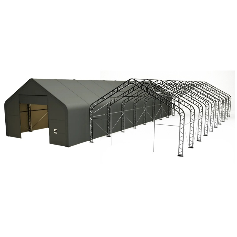 Skladová, stanová hala příhradová konstrukce 9,15 x 27,45 x 6,1 m + plachta 900 g/m2 - stanová (skladová) hala, známá také jako sedlová hala, disponuje dvojitou pozinkovanou ocelovou konstrukcí, která je kryta vysoce odolnou zelenou nebo bílou PVC plachtou (barvu prosím specifikujte v objednávce). Vstup je možný z přední i zadní strany - otvírání pomocí ručního navijáku (elektrický naviják je za příplatek). Plachta přístřešku je z PVC, který je nepromokavý, UV odolný a má životnost více než 20 let.
