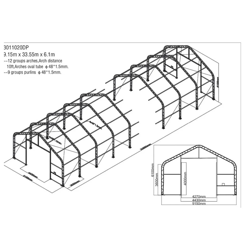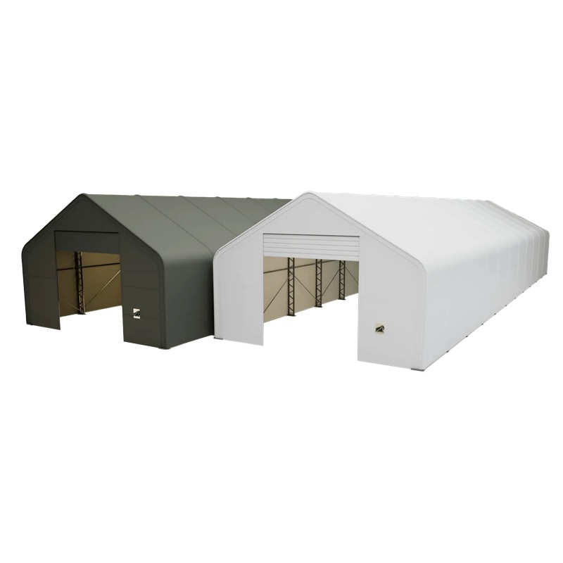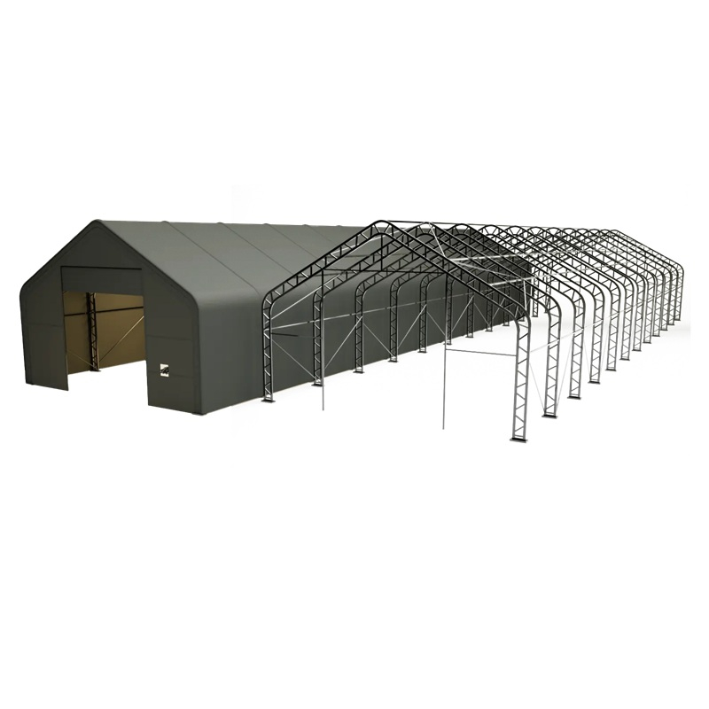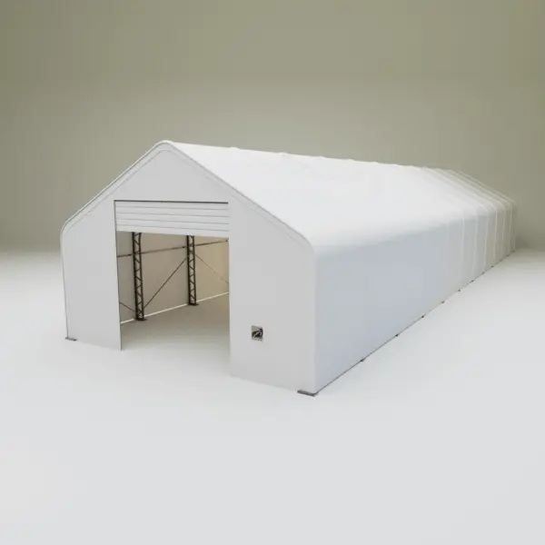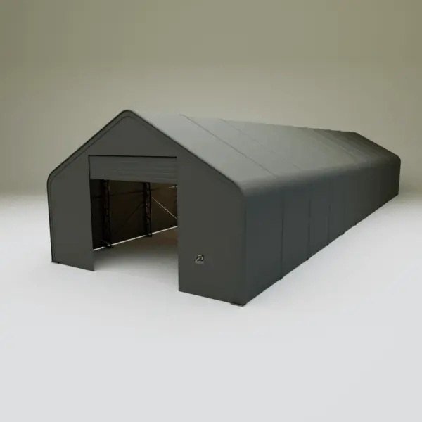Skladová, stanová hala příhradová konstrukce 9,15 x 33,55 x 6,1 m + plachta 900 g/m2 - stanová (skladová) hala, známá také jako sedlová hala, disponuje dvojitou pozinkovanou ocelovou konstrukcí, která je kryta vysoce odolnou zelenou nebo bílou PVC plachtou (barvu prosím specifikujte v objednávce). Vstup je možný z přední i zadní strany - otvírání pomocí ručního navijáku (elektrický naviják je za příplatek). Plachta přístřešku je z PVC, který je nepromokavý, UV odolný a má životnost více než 20 let.