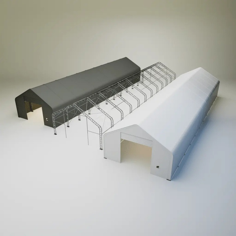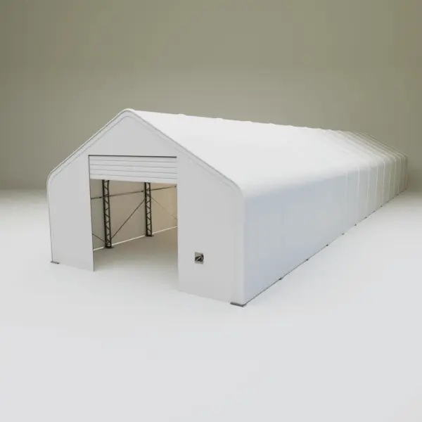Skladová, stanová hala příhradová konstrukce 9,15 x 36,6 x 6,1 m + plachta 900 g/m2 - stanová (skladová) hala, známá také jako sedlová hala, disponuje dvojitou pozinkovanou ocelovou konstrukcí, která je kryta vysoce odolnou zelenou nebo bílou PVC plachtou (barvu prosím specifikujte v objednávce). Vstup je možný z přední i zadní strany - otvírání pomocí ručního navijáku (elektrický naviják je za příplatek). Plachta přístřešku je z PVC, který je nepromokavý, UV odolný a má životnost více než 20 let.