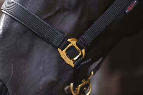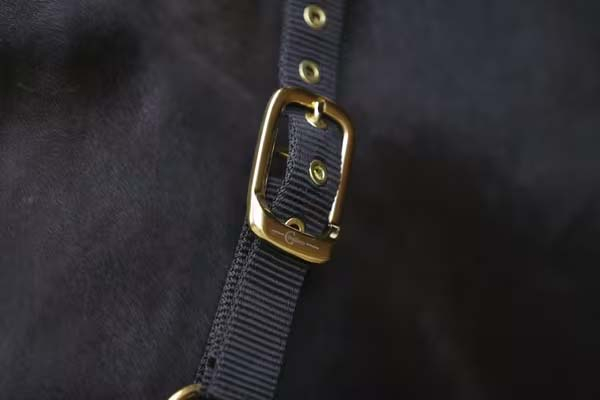 Ohlávka je vyrobena z pevného, oděruvzdorného materiálu a má zesílené trojitě prošité švy, které zvyšují její životnost i při pravidelném používání. Pevné kovové kování je nejen odolné, ale zároveň působí elegantně. Praktická karabina umožňuje rychlé a pohodlné zapínání i odepínání.