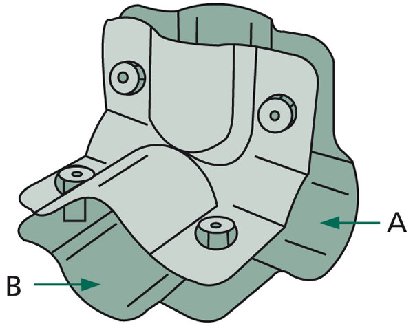 Stájová rohová spona dvojdílná se 4 šrouby průměr A 34 mm (1") B 34 mm (1") - spojka na trubky, svorka trubek.