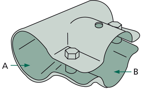 Stájová trubková T spona jednodílná se 2 šrouby průměr A 48 mm (1 1/2") B 34 mm (1") - spojka na trubky, svorka trubek.