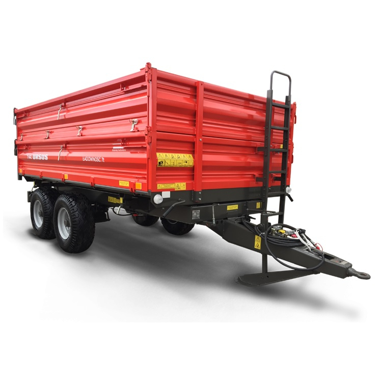 Tandemový sklápěcí návěs za traktor URSUS T 080/2A dvouosý tandem 3 straně sklopný 10 t - dvounápravový tandemový návěs T 080/2A je robustní 3stranně sklápěný návěs určený pro přepravu sypkých i kusových materiálů. Je vybaven profilovanými bočnicemi o výšce 600 + 600 mm s centrálním jištěním k podlaze, což zajišťuje pevnost konstrukce a bezpečné uzavření korby. Šířka korby činí 2110 mm, celkové rozměry ložné plochy jsou 4410 × 2410 × 600 + 600 mm a objem skříně dosahuje 10,37 m3. Celková délka návěsu je 5955 mm, šířka 2550 mm a výška 1710 / 2200 mm. Nosnost činí 10 000 kg při hmotnosti stroje 2732 kg, tlak na závěs je 1757 kg. Konstrukční rychlost je 30 km/h a doporučený výkon traktoru 95 k.