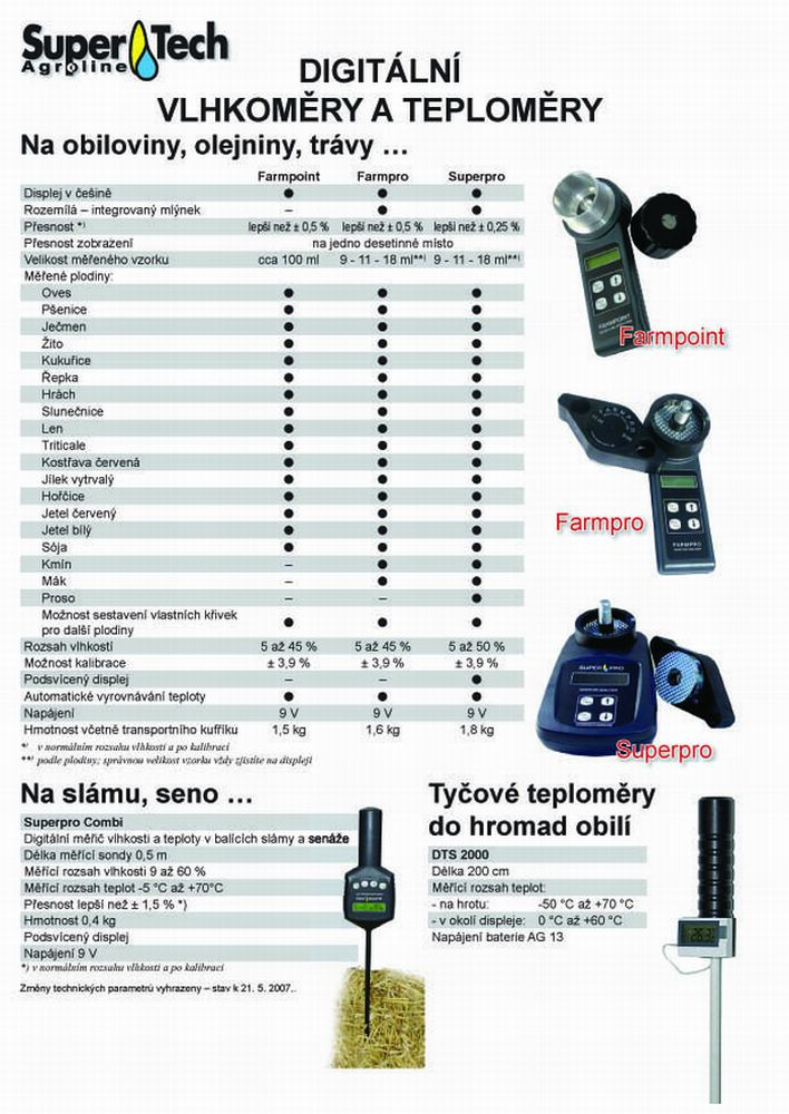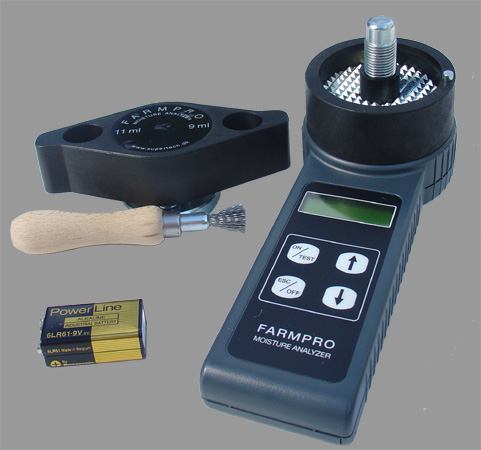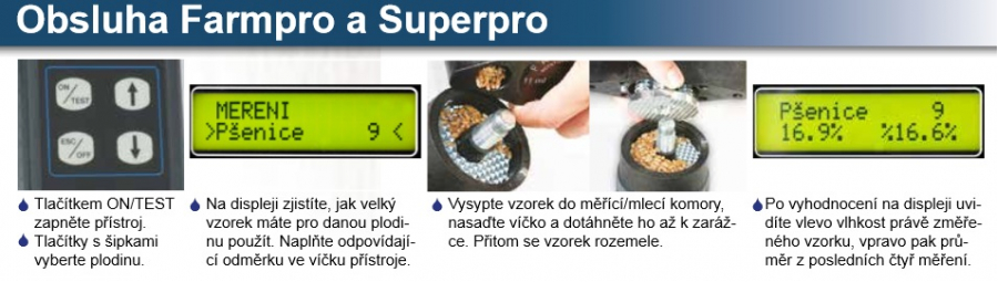 Farmpro - digitální vlhkoměr na obilí a semena olejnin, trav a dalších plodin Farmpro poskytuje nezbytnou pomoc na poli při určování nejvhodnější doby sklizně a používá se také k pravidelnému měření vlhkosti během procesu sušení a při skladování. Měří vnitřní vlhkost 19 druhů plodin, a to pomocí zjištění elektrické vodivosti vzorku, nabízí i možnost sestavení vlastní měřící křivky pro další plodiny. Jedná se o přenosný ruční měřič vlhkosti rozemletých zrn a semen. Spolehlivých výsledků se dosahuje rozemletím vzorku, jeho stlačením a automatickým vyrovnáním teploty, a to vše současně, v jednom kroku.