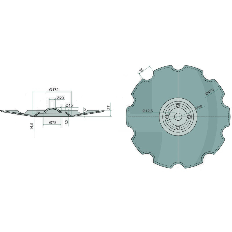 Výsevný disk secí botky 470 x 5 mm pro secí stroj Väderstad Carrier, TopDown bez ložiska 10 zubů 4 díry - referenční číslo 179857. 10 zubů, průměr disku 470 mm, roztečná kružnice průměr = 98 mm.